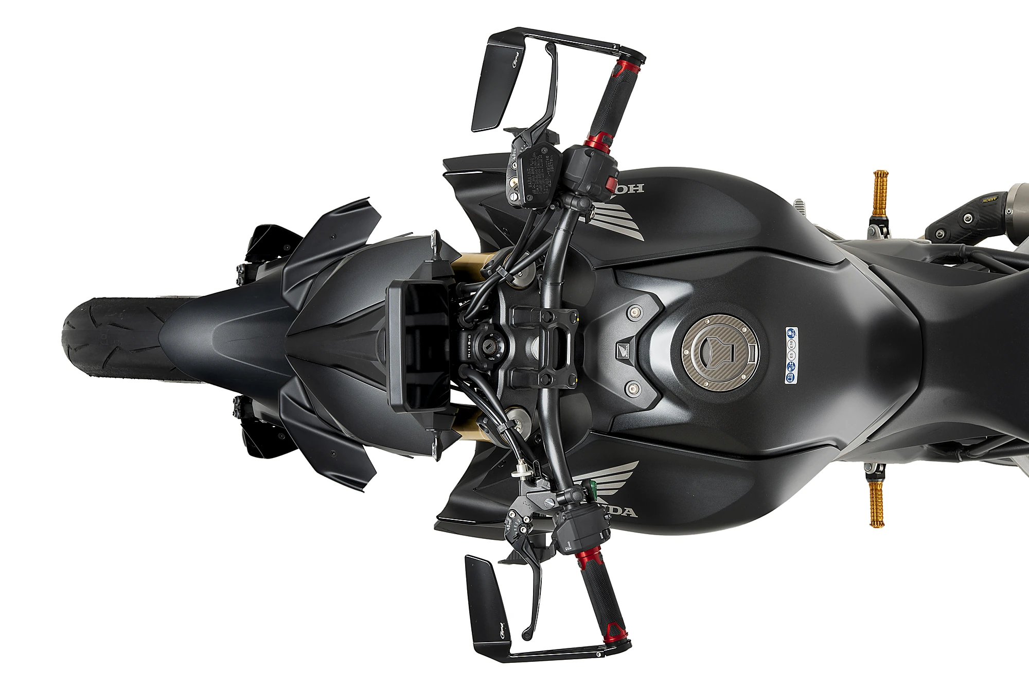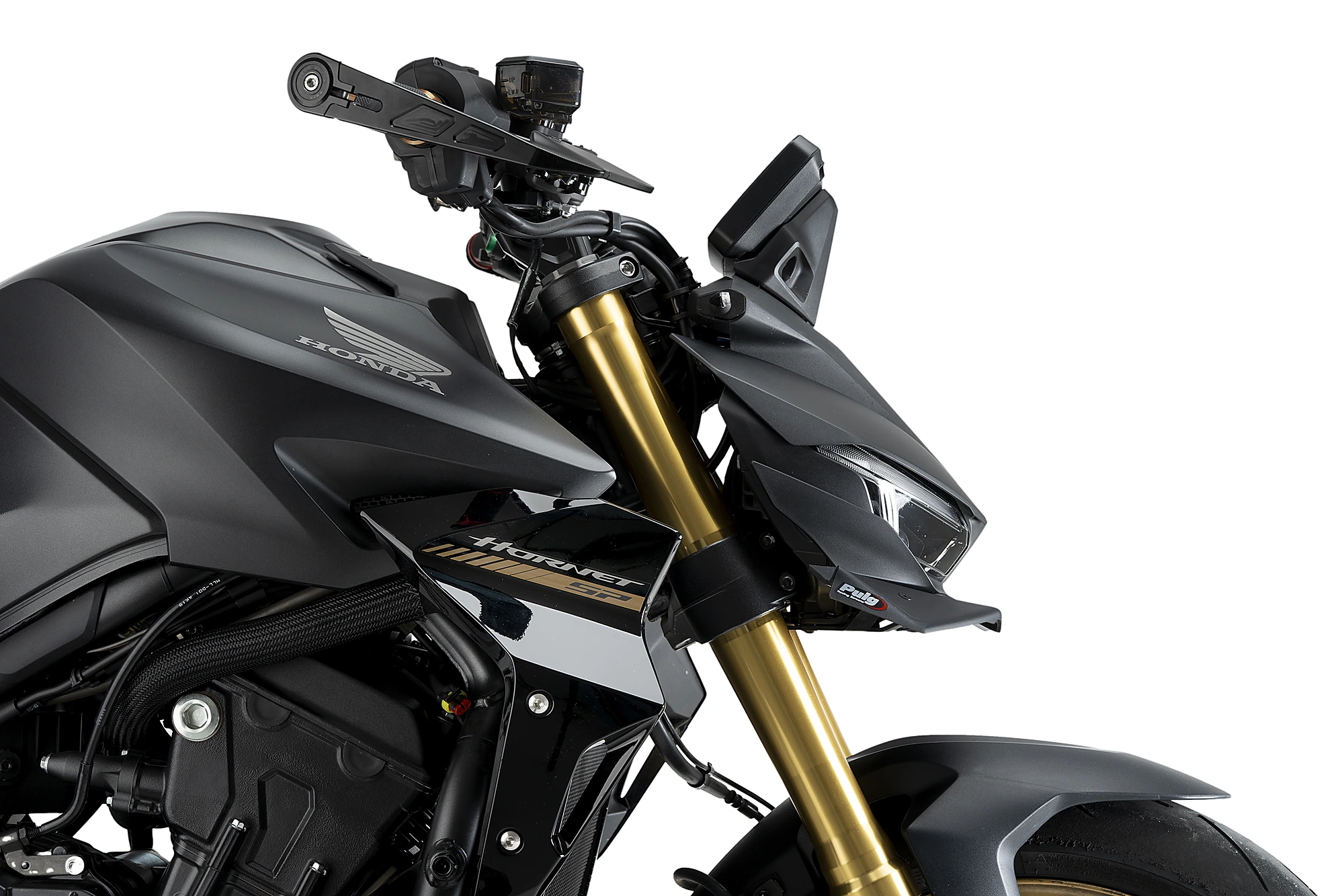 Inspirat directament en els alerons utilitzats a MotoGP, l’aleró frontal per a la Honda CB1000 Hornet 2025 ha estat desenvolupat per millorar les prestacions aerodinàmiques sense renunciar a una estètica agressiva i perfectament integrada a la moto. Les seves àmplies superfícies alars reforcen l’amplada visual del frontal, potenciant el caràcter esportiu de la Hornet i realçant les seves línies originals.