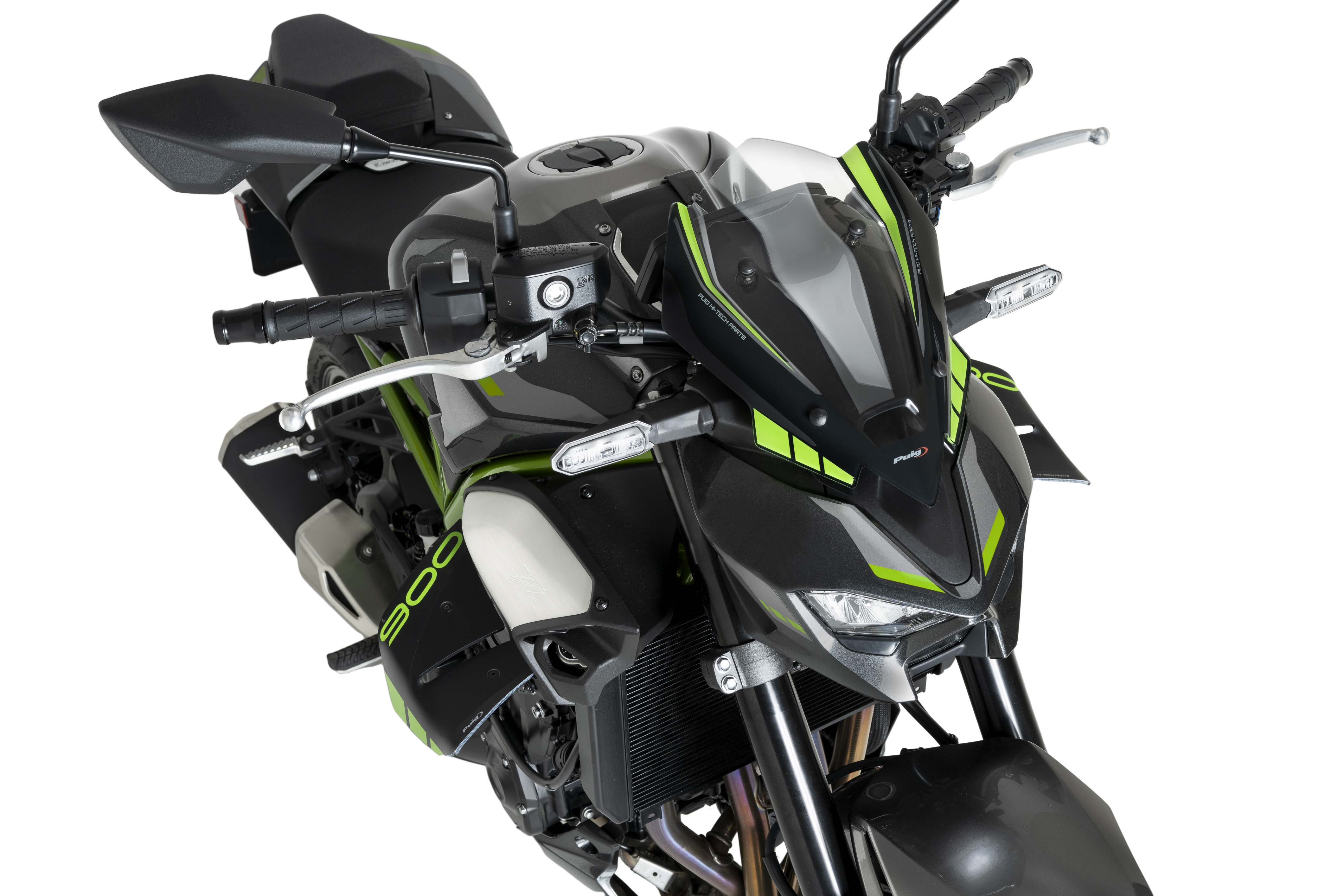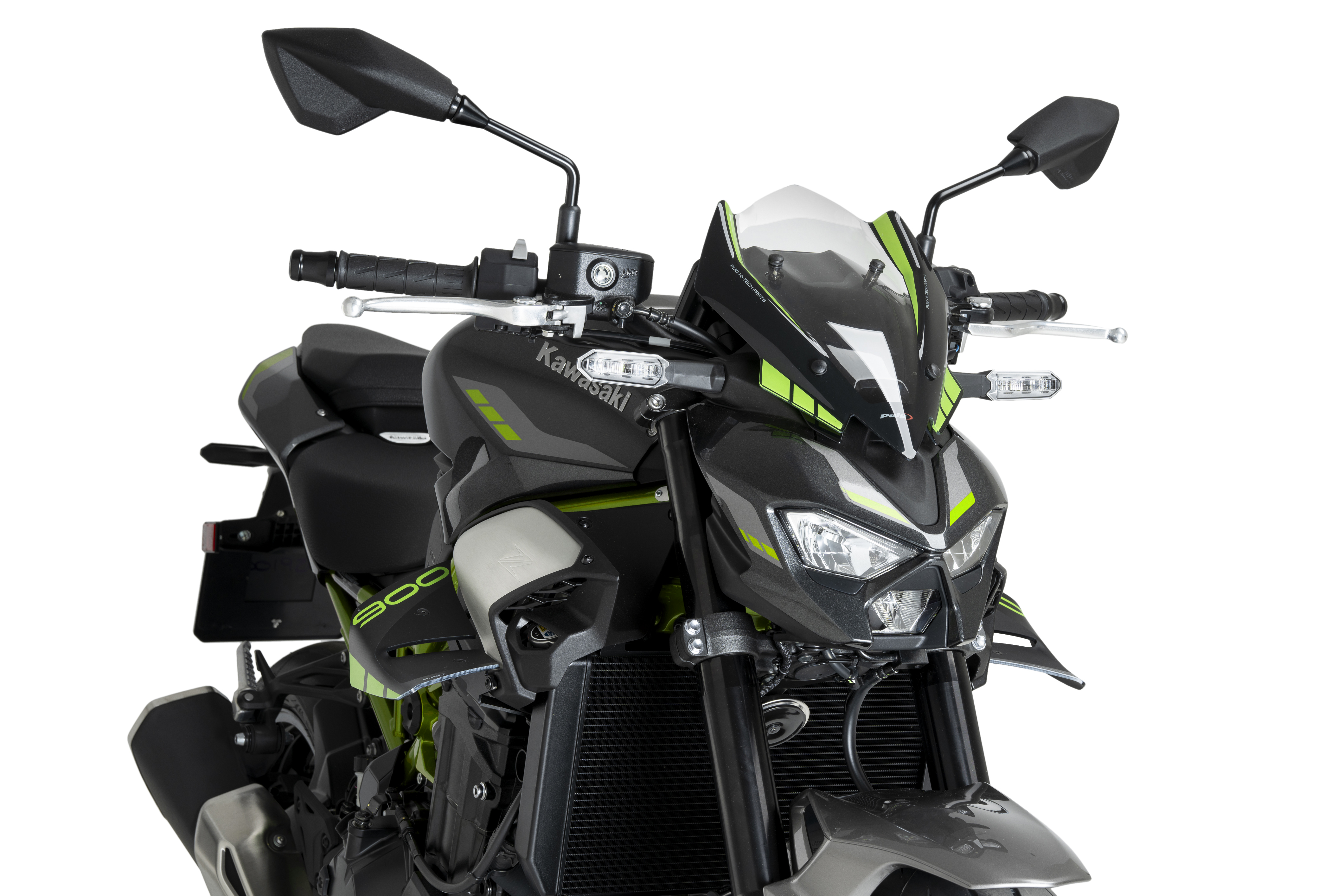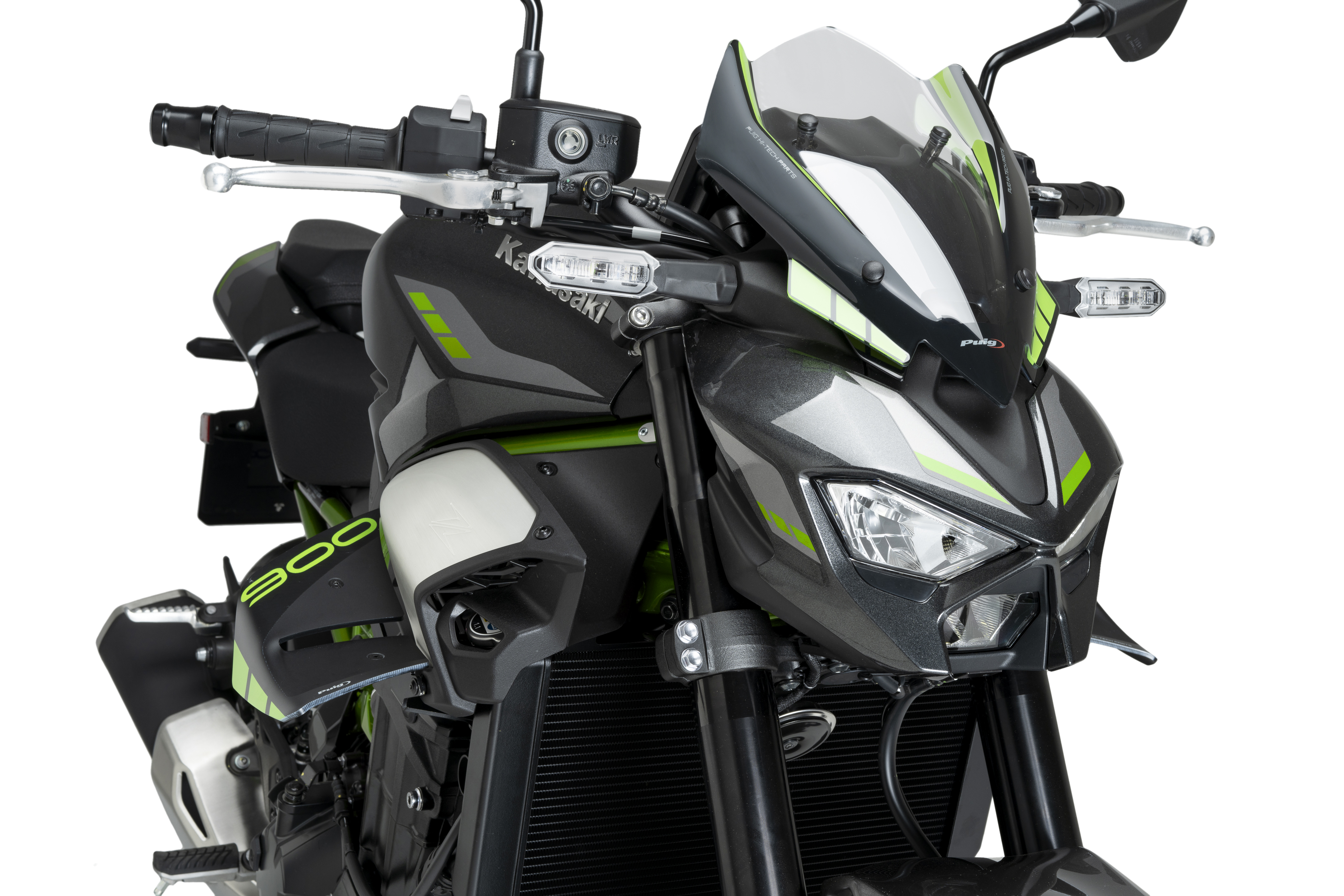 La cúpula NG Sport de Puig per a la nova Kawasaki Z900 2025 ha estat dissenyada per reforçar el caràcter agressiu i esportiu d’aquesta icònica naked. El seu disseny compacte i estilitzat cobreix completament el quadre d’instruments, netejant aerodinàmicament la zona frontal i millorant l’estètica general del conjunt.