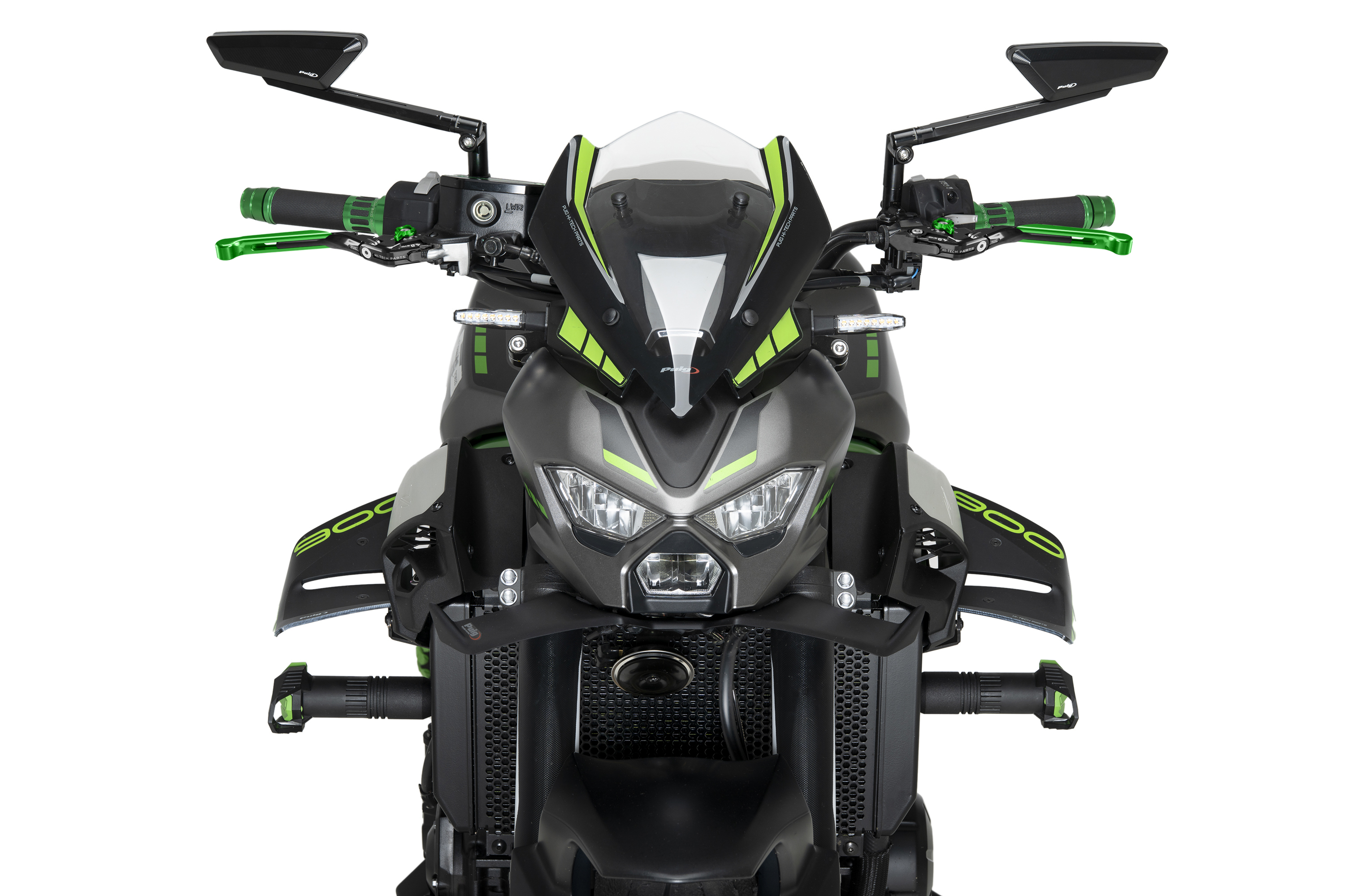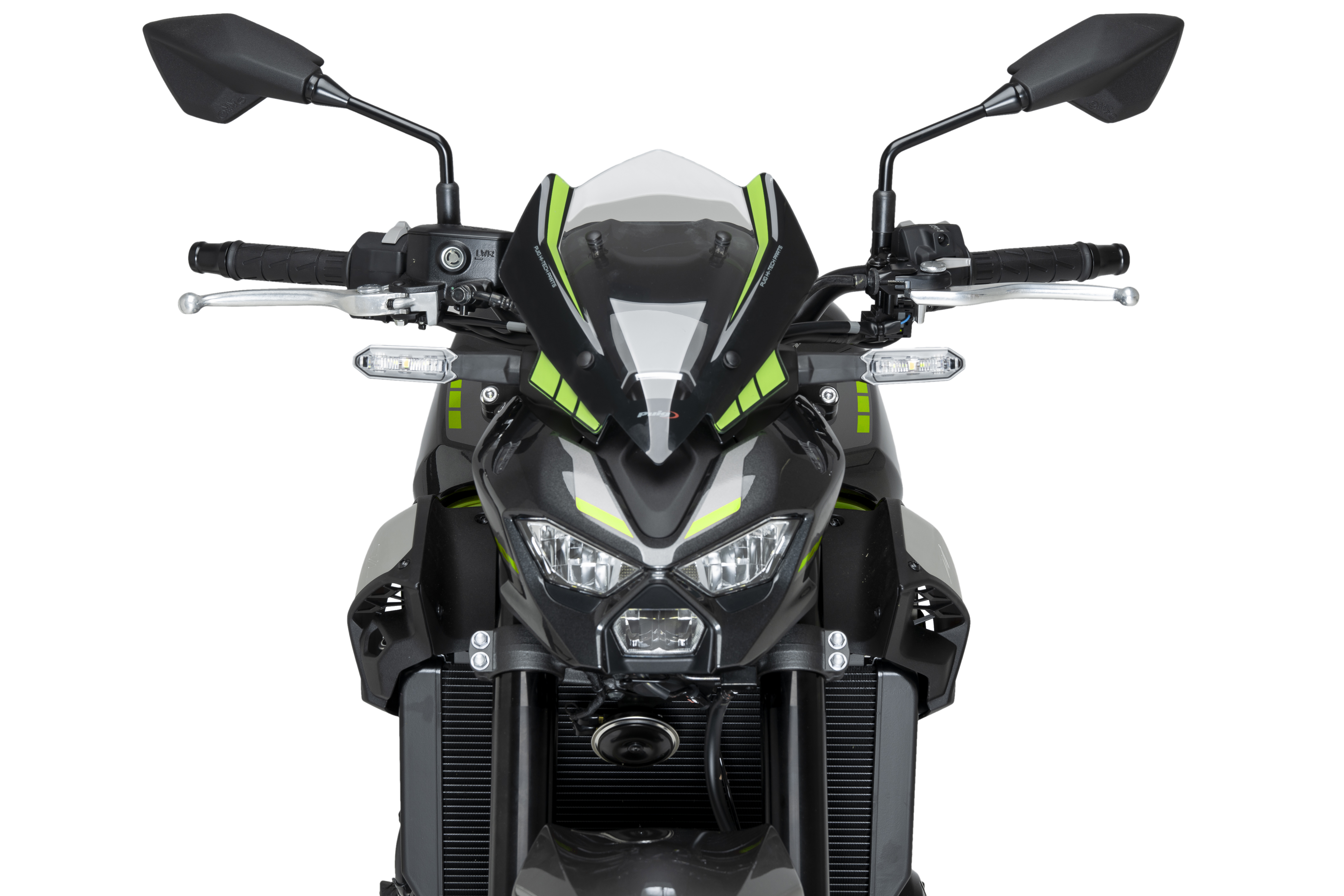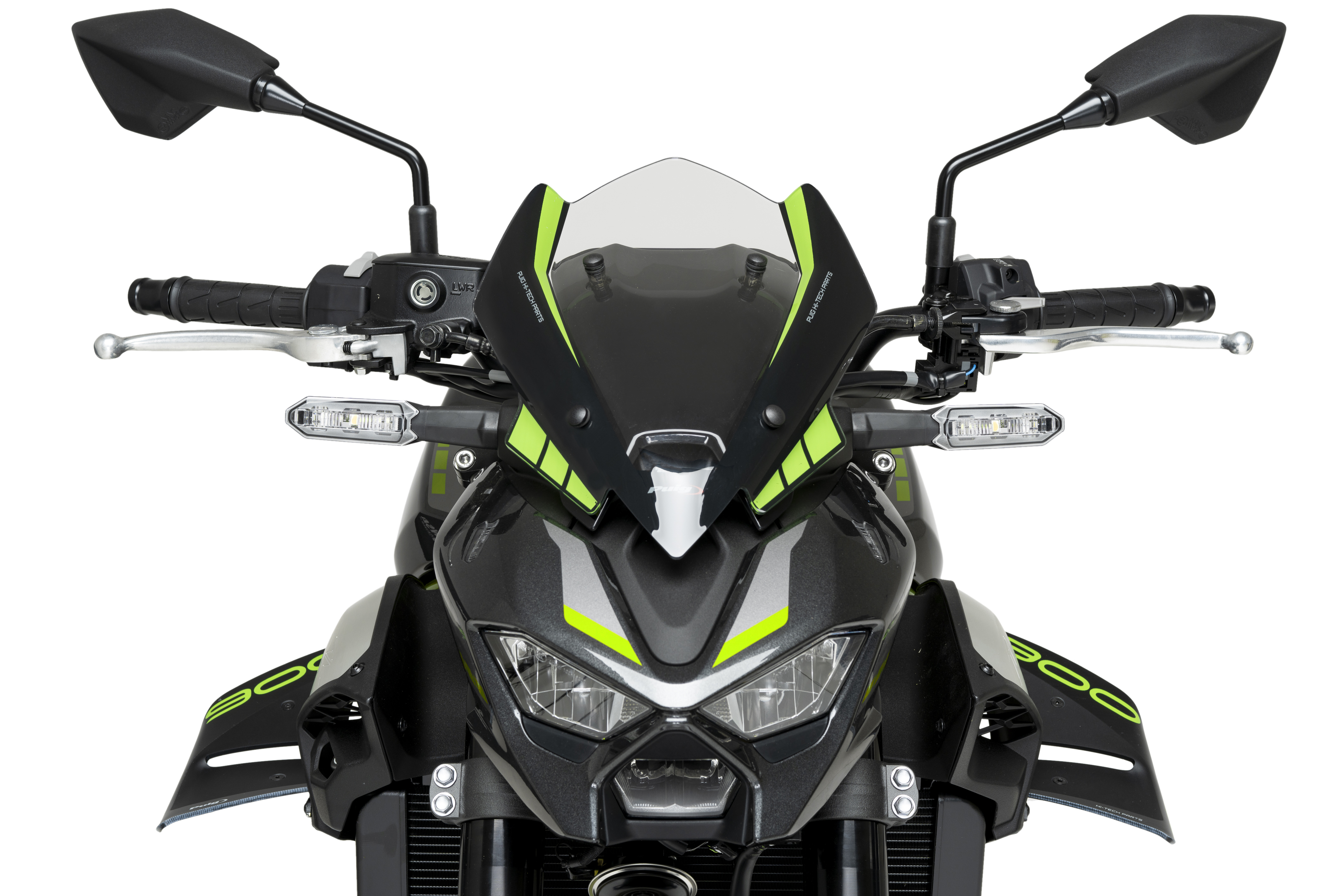 La cúpula NG Sport de Puig per a la nova Kawasaki Z900 2025 ha estat dissenyada per reforçar el caràcter agressiu i esportiu d’aquesta icònica naked. El seu disseny compacte i estilitzat cobreix completament el quadre d’instruments, netejant aerodinàmicament la zona frontal i millorant l’estètica general del conjunt.