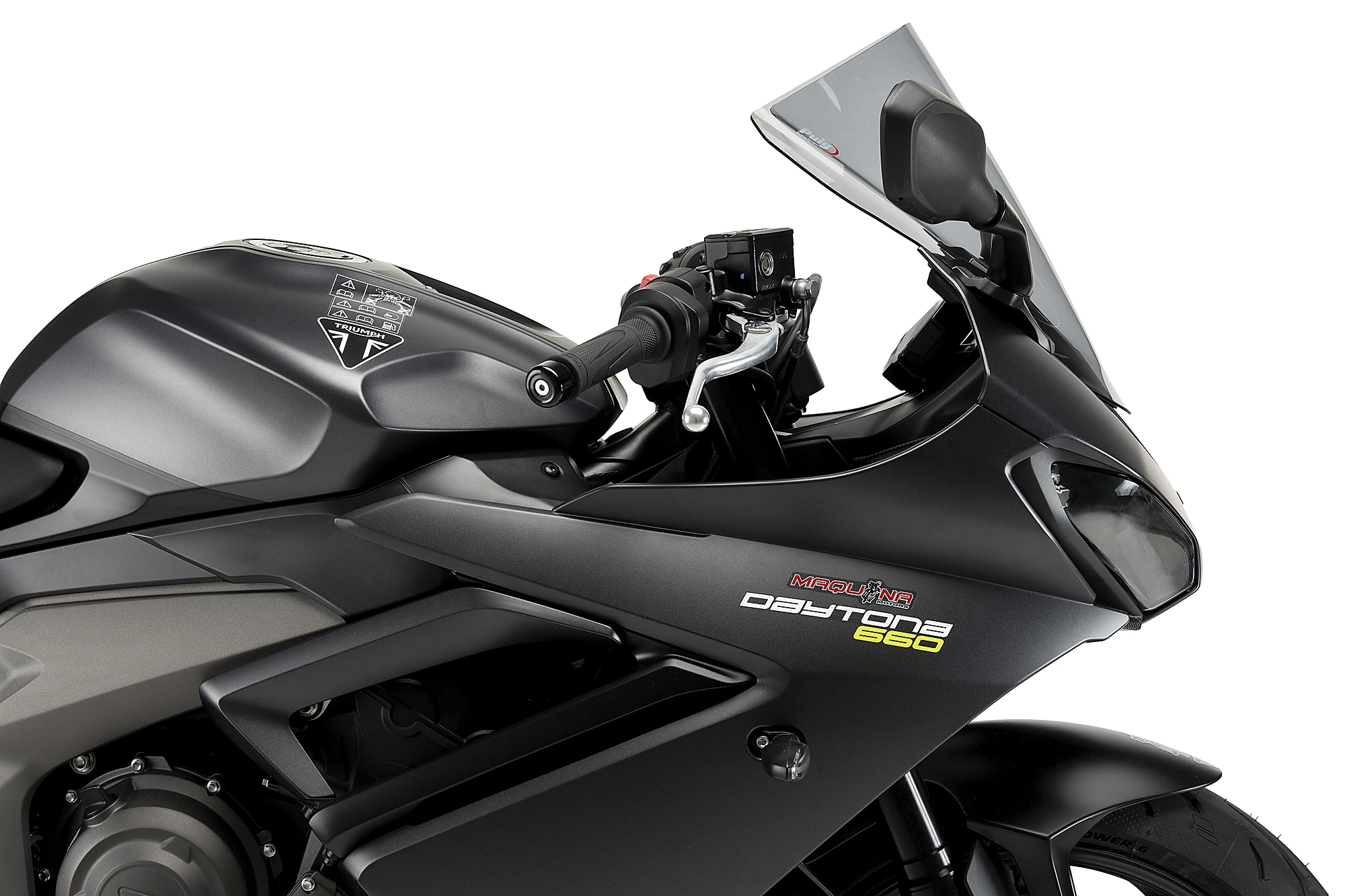 El seu disseny, inspirat en les pantalles utilitzades en els campionats de MotoGP i WorldSBK, manté la forma original però augmenta l'alçada per aconseguir una millor aerodinàmica del pilot, alhora que proporciona un aspecte esportiu i personalitzat a la teva TRIUMPH DAYTONA 660. Aquesta millora aerodinàmica farà que el pilot experimenti menys molèsties al casc en zones on es fan altes velocitats, com la recta d'un circuit.