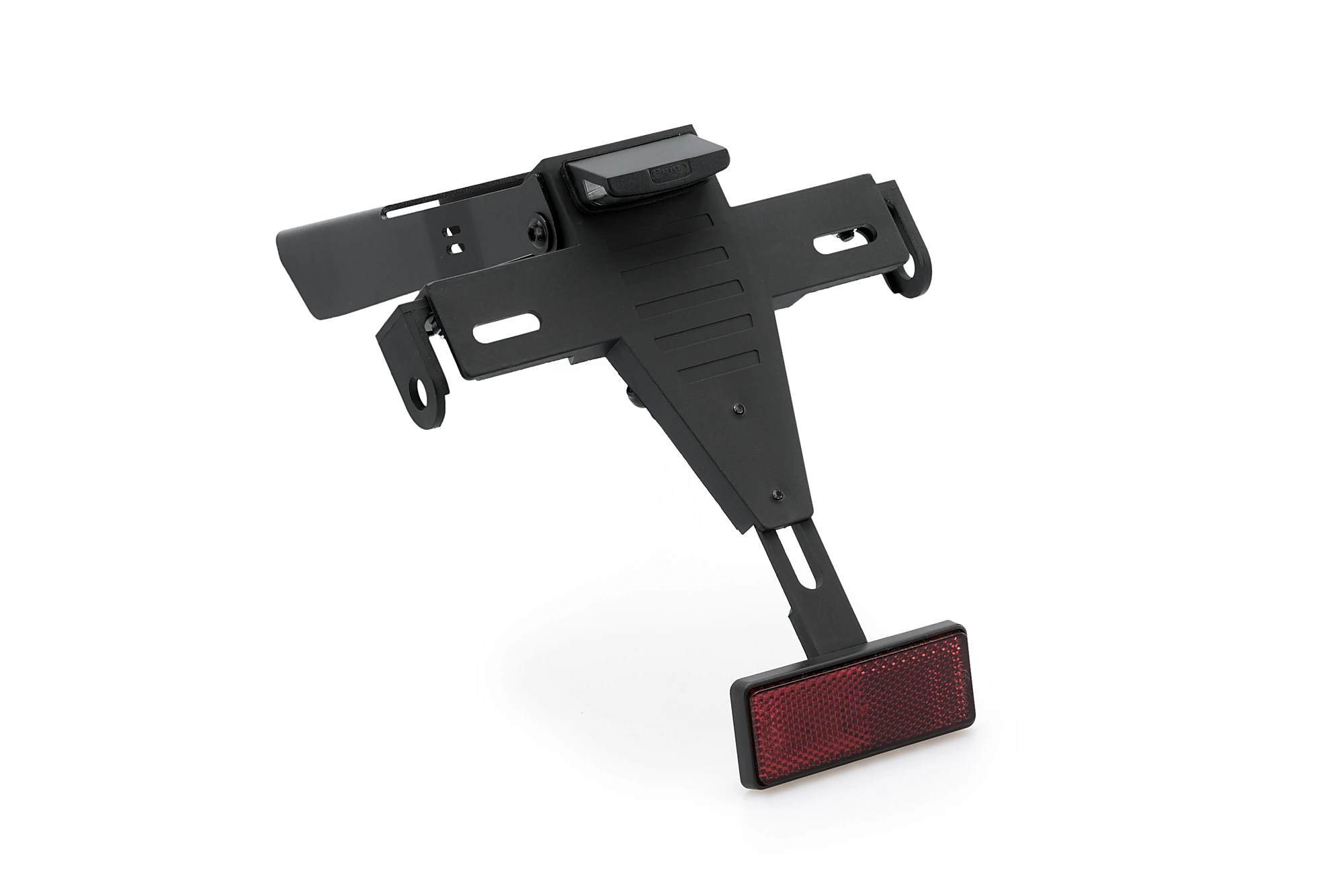 Substitueix el portamatrícules original de la teva moto pel suport portamatrícules de Puig, que, gràcies a la seva ubicació elevada, proporciona un aspecte esportiu a la teva motocicleta. El conjunt combina peces d’acer amb acabat en pintura epoxi i elements de poliamida, aconseguint una notable reducció de pes en comparació amb el suport original.