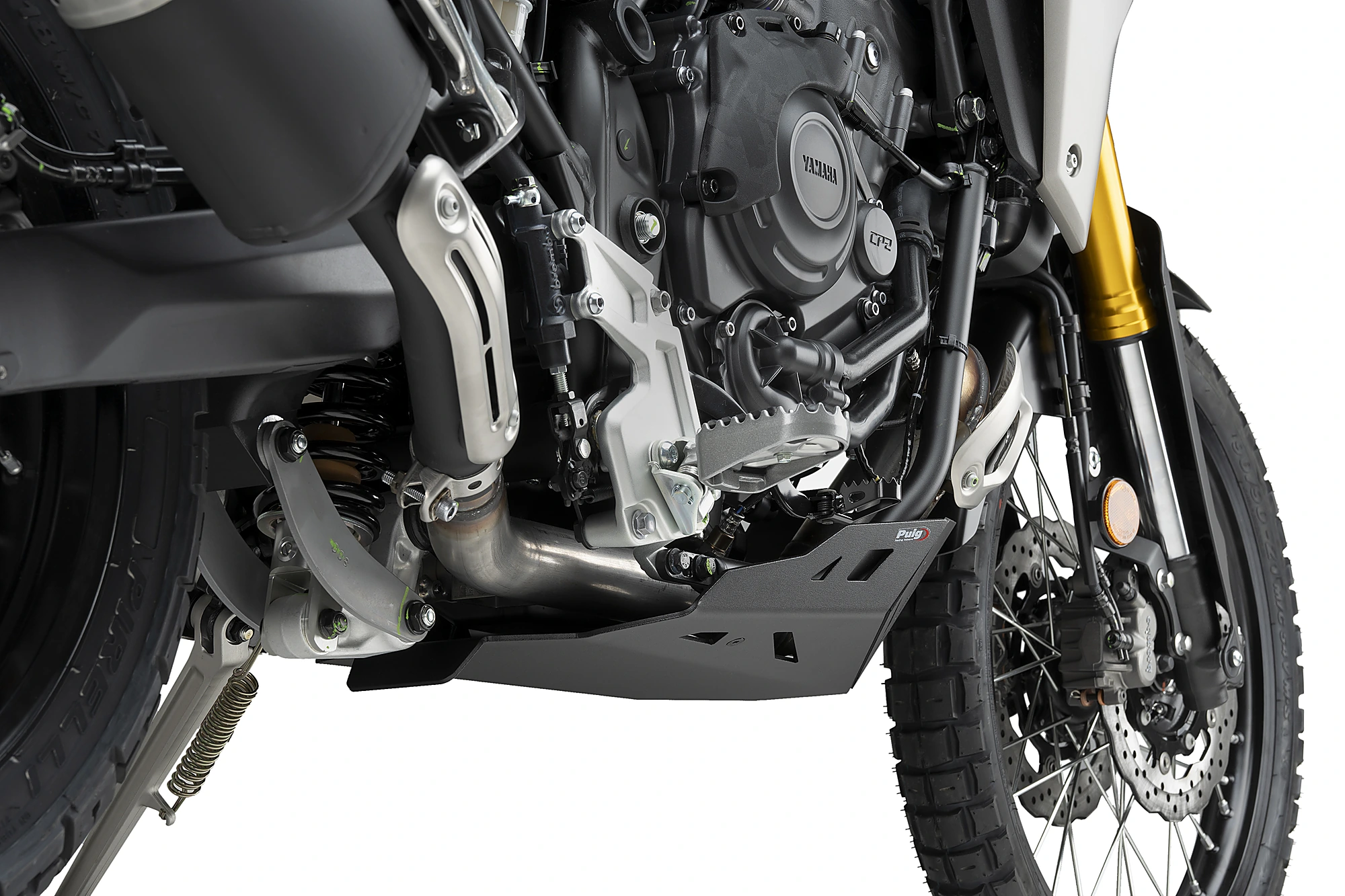 Protegeix els baixos del motor de la Yamaha Tenere 700 amb el protector de càrter de Puig. Amb un disseny senzill però agressiu, el protector de Puig és més llarg que la peça original que substitueix, permetent protegir el catalitzador i la suspensió, zones que, en la pràctica de l’off-road, queden molt exposades. La seva instal·lació millora la protecció de parts sensibles, com els baixos del motor, davant impactes de pedres, fang, etc.