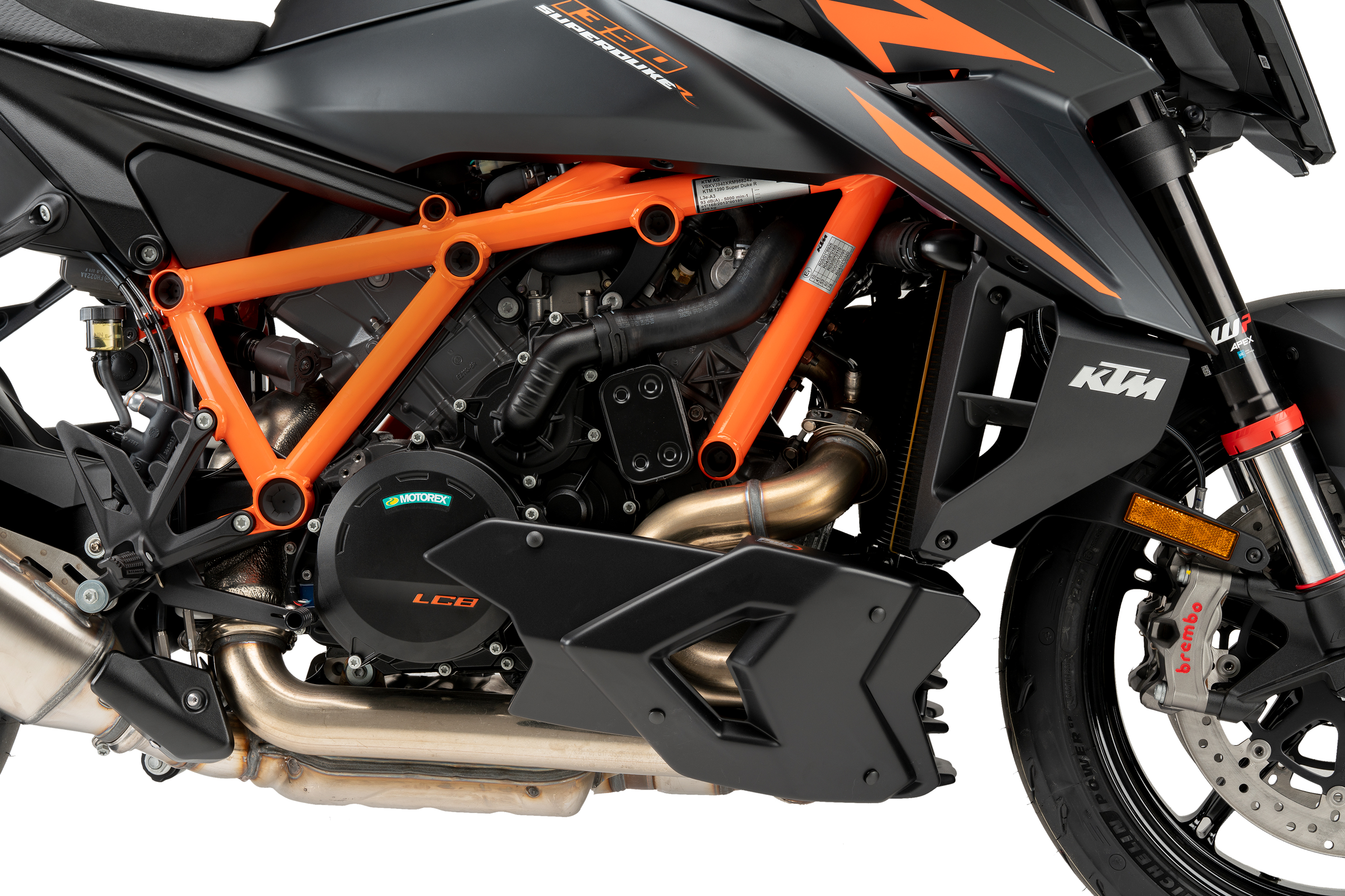 Steigern Sie das Wettbewerbsimage Ihrer KTM 1290 Superduke R 2020- mit dem neuen Puig-Motorspoiler. Bestehend aus zentralen aggressiven Linien, die einem Kühler ähnelt, mit Öffnungen, durch die die Luft zum Motor geleitet wird, und seitlichen Abdeckungen mit raffinierten Linien, die Geschwindigkeit signalisieren, eine stärkere Aerodynamik erzeugen und Turbulenzen im Bereich des Motors vermeiden.