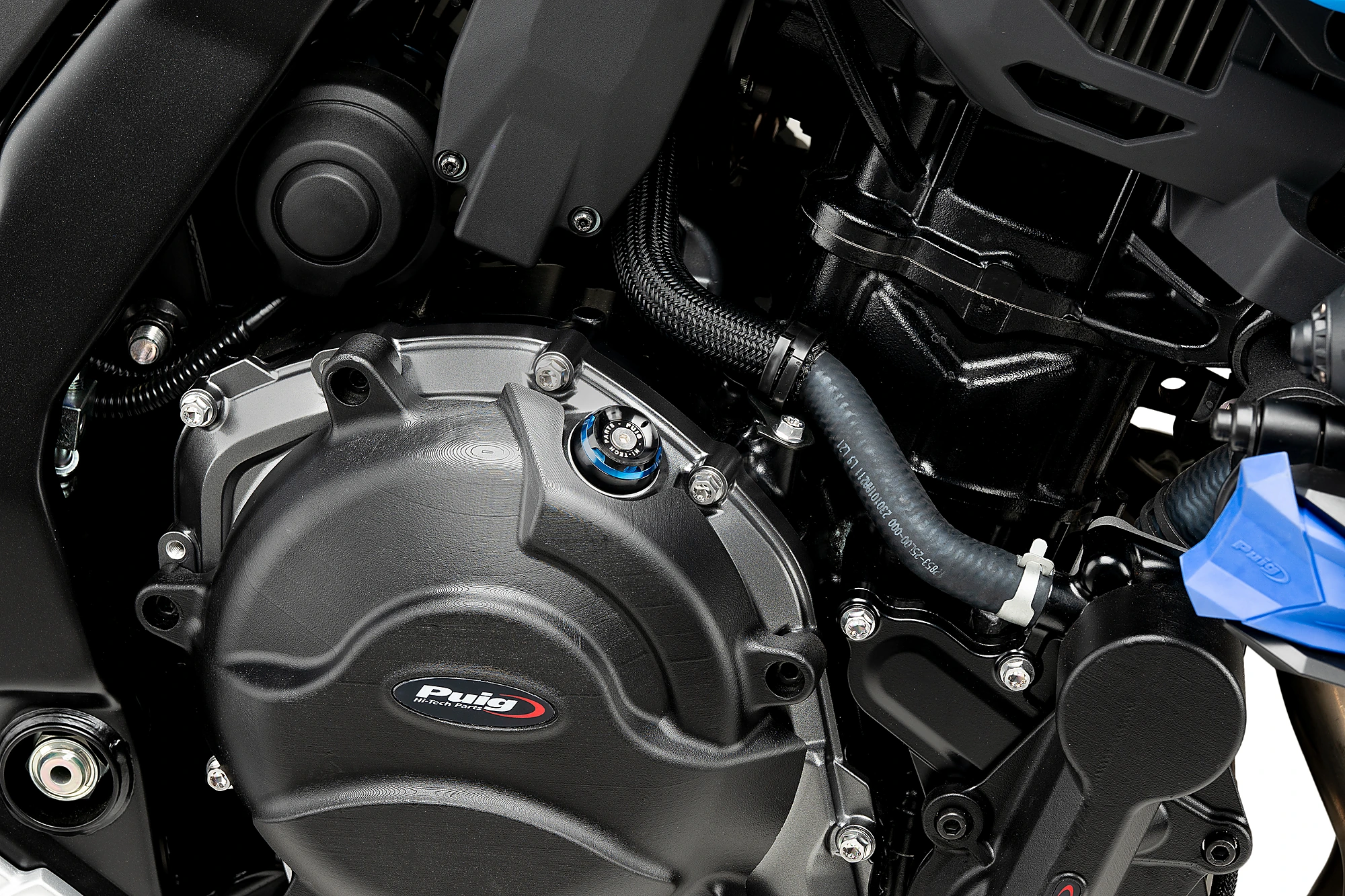 Vom rein funktionalen Originalteil zum Designteil, das sich in der Motorbaugruppe auszeichnet. Der markante Renncharakter wird aufgrund seiner reduzierten Abmessungen und Bearbeitungslinien durch die Eleganz eines schwarz eloxierten Sets und eines farbigen Rings ergänzt, der es ermöglicht, sich in den Rest des Motorrads einzufügen.
