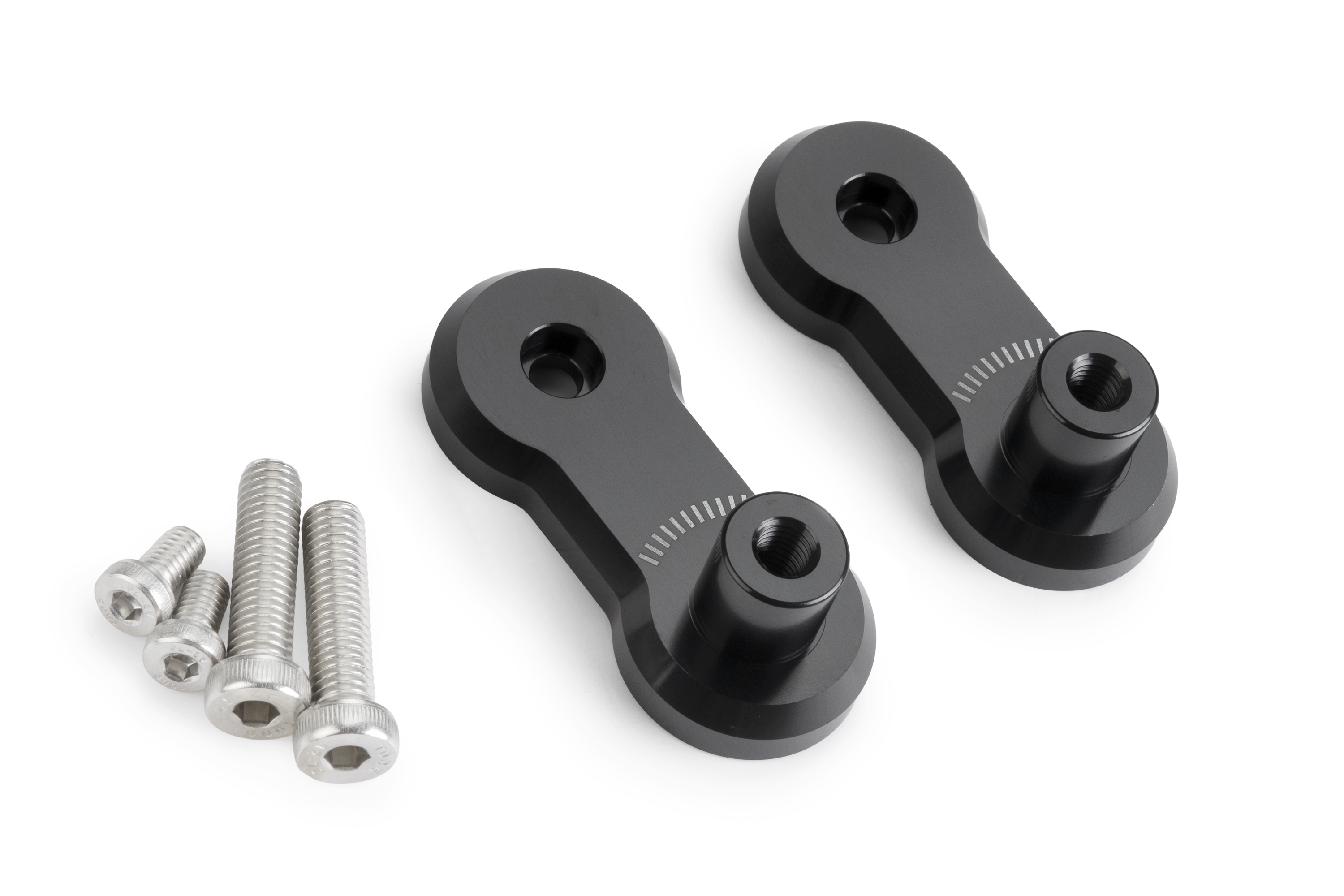 20mm lange Verlagerungshalter. Dieses Set, zusammen mit den verstellbaren Fußrastenadptern, ermöglicht es Ihnen, die Fußrasten um 20mm im Radius zu verlängern und einen Abstand von 15 Grad zu ermöglichen.