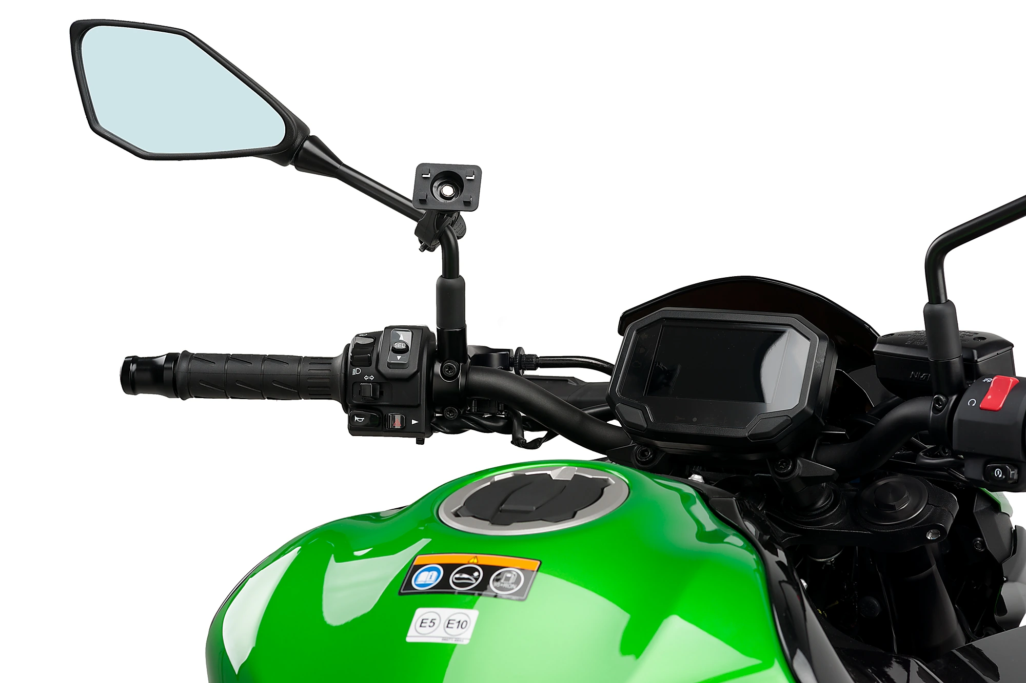 Sie können die Handyhalterung am Sockel des Spiegels, an der Spiegelstange, am Lenker und an der Sattelstütze des Motorrads anbringen. Bei letzterer ist das Handy besser gegen mögliche Stöße oder Schlaglöcher auf der Straße geschützt.