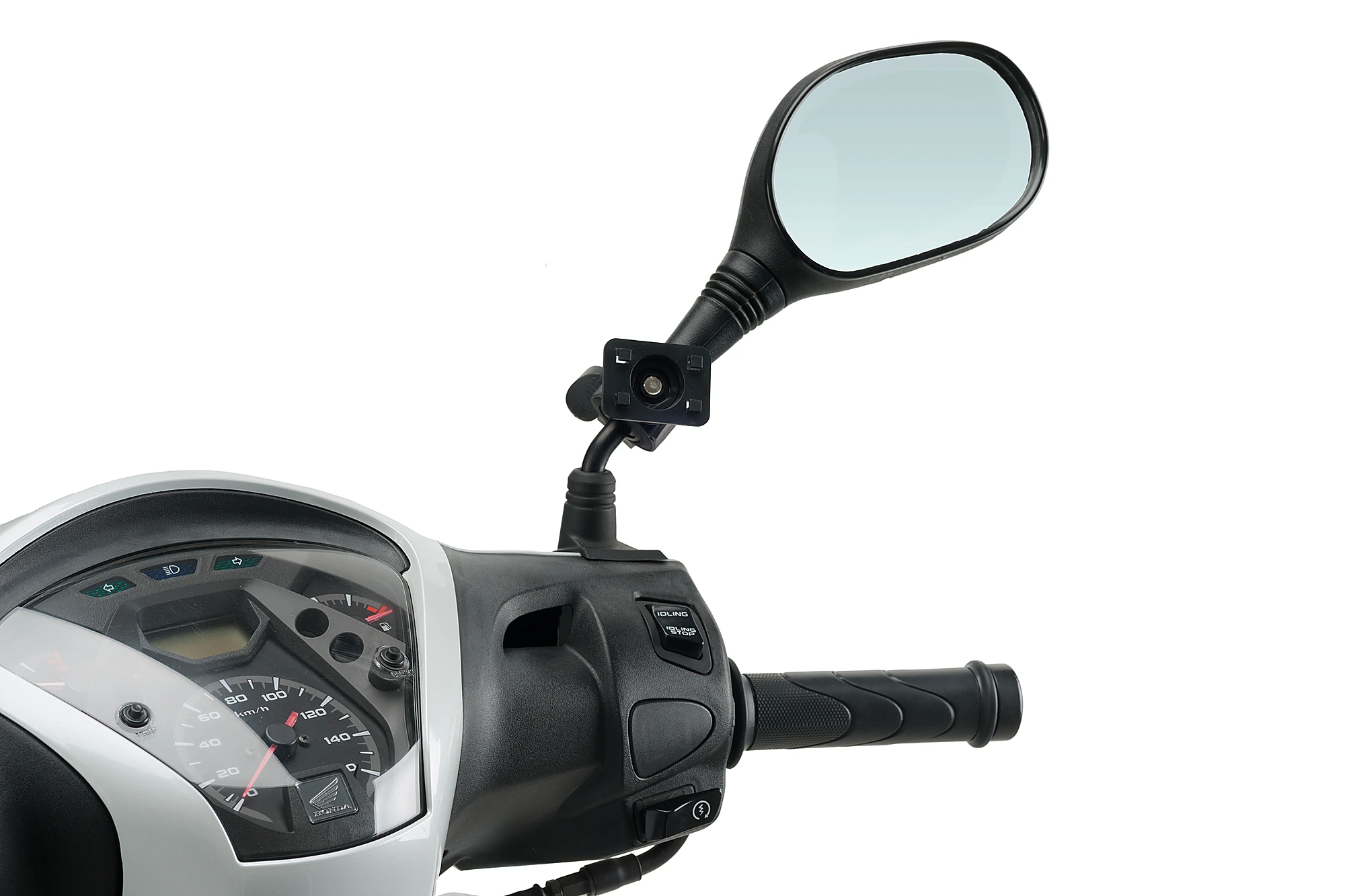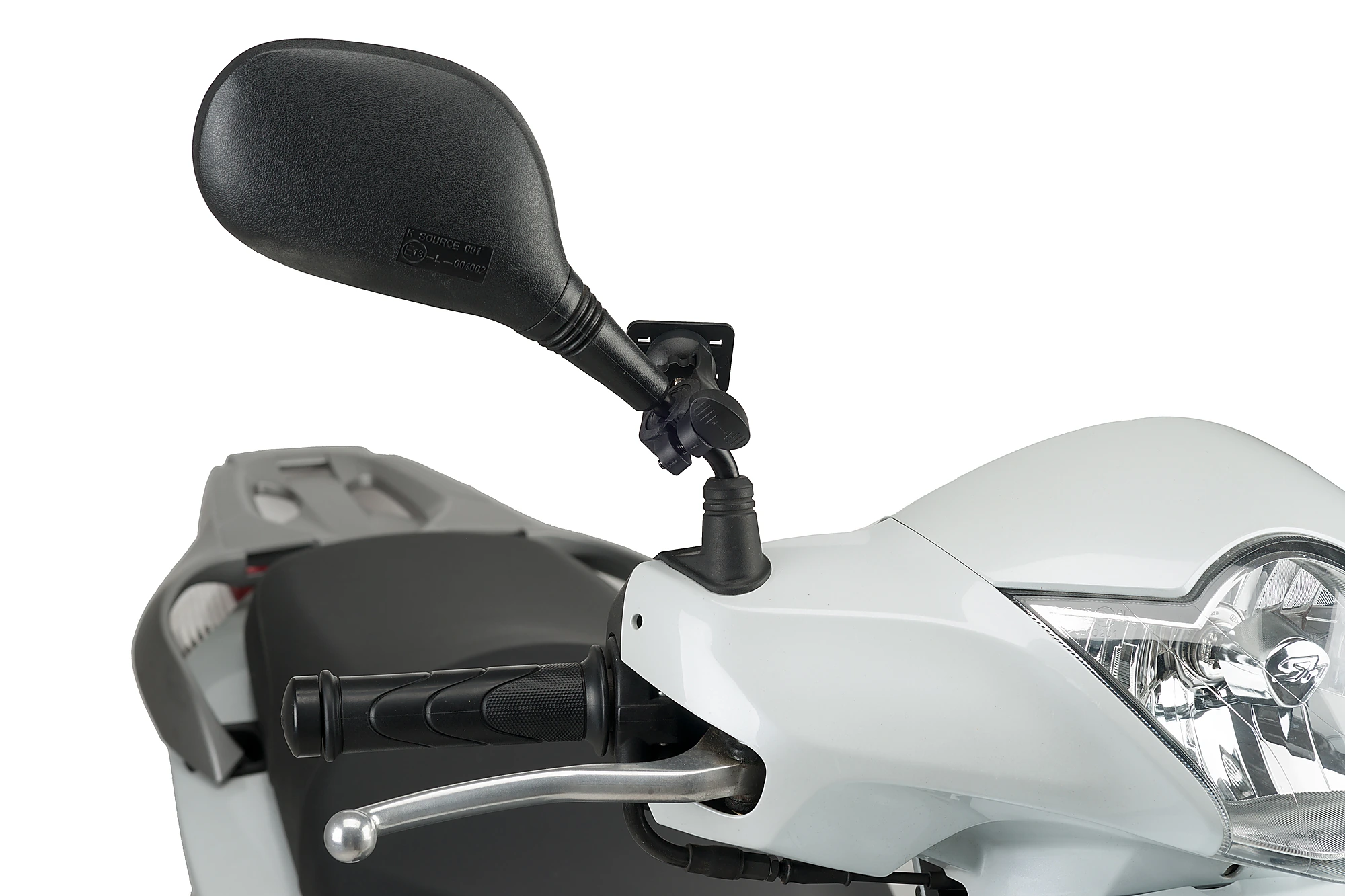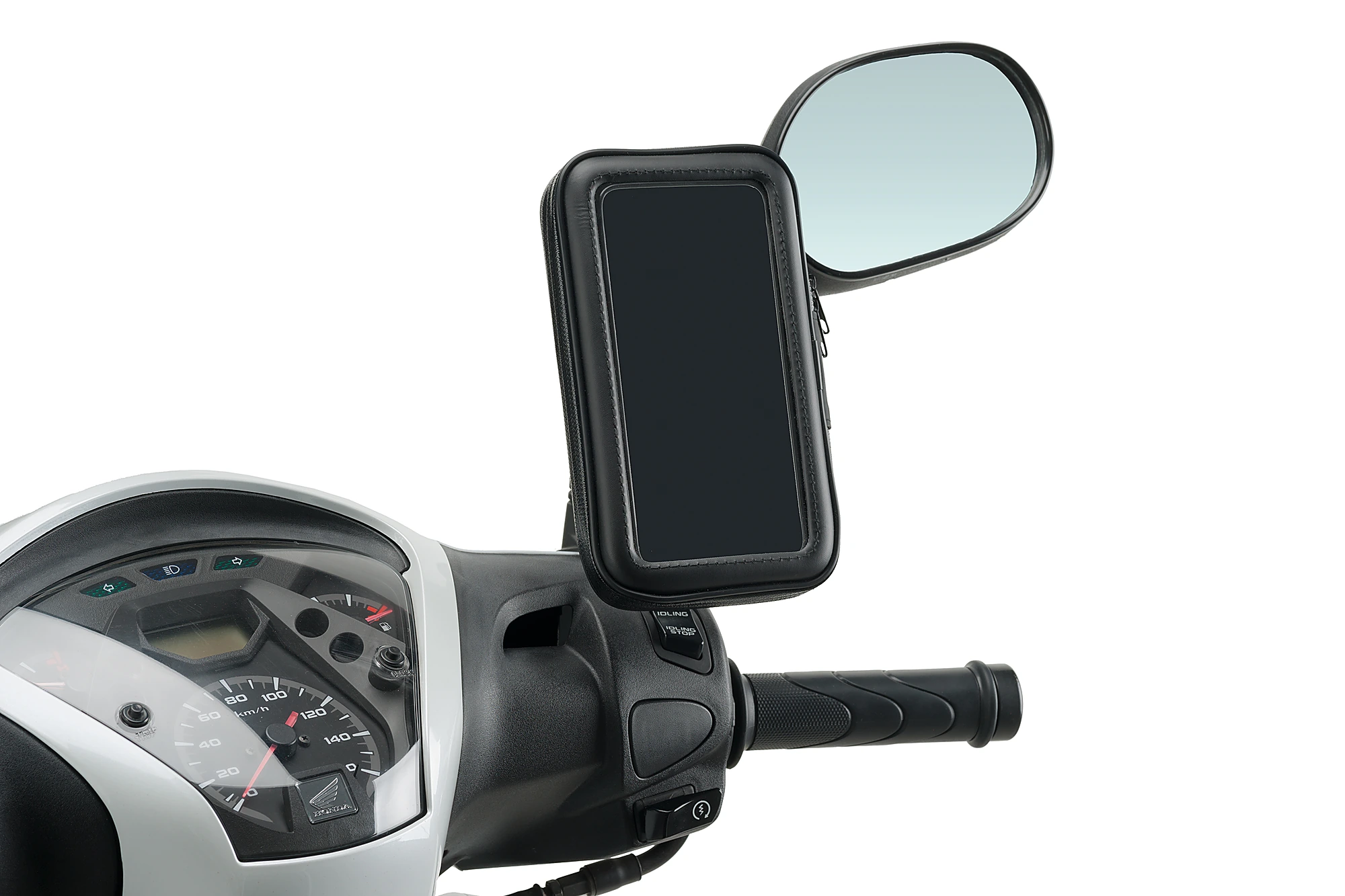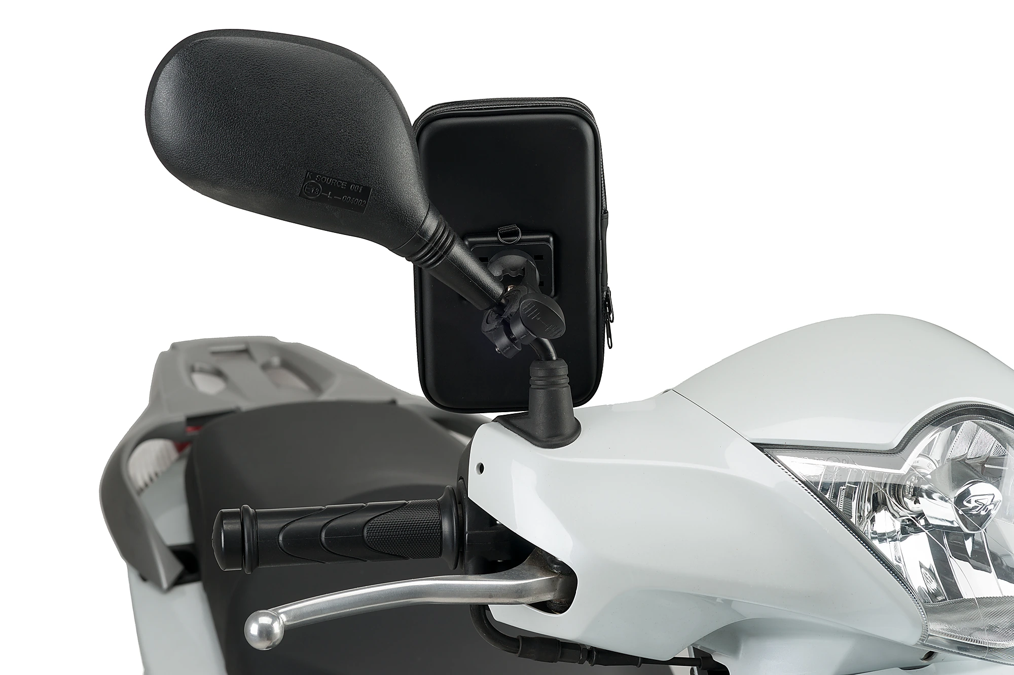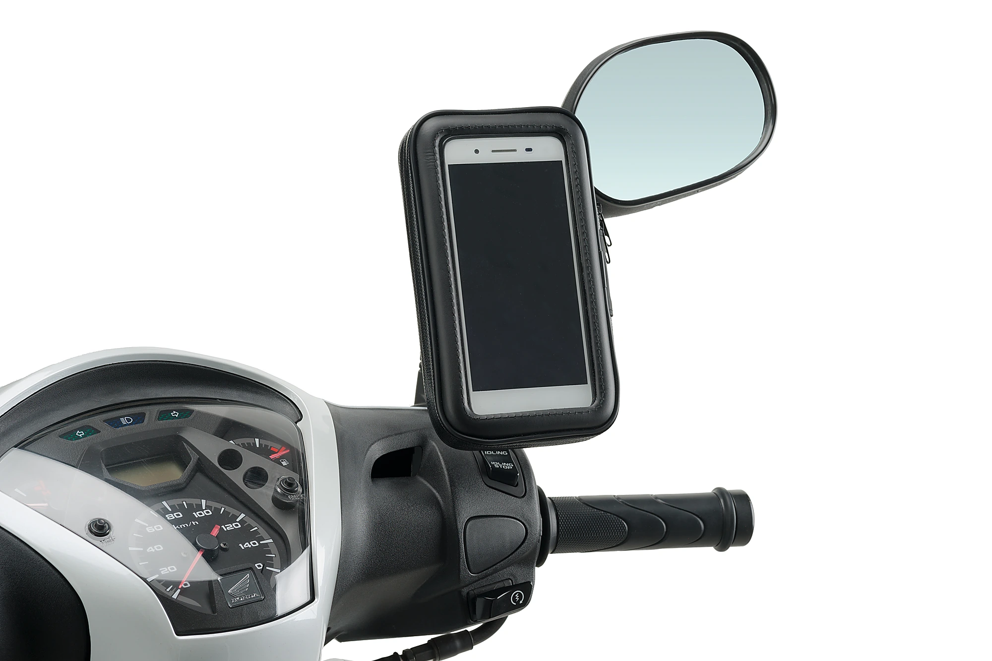 Sie können die Handyhalterung am Sockel des Spiegels, an der Spiegelstange, am Lenker und an der Sattelstütze des Motorrads anbringen. Bei letzterer ist das Handy besser gegen mögliche Stöße oder Schlaglöcher auf der Straße geschützt.