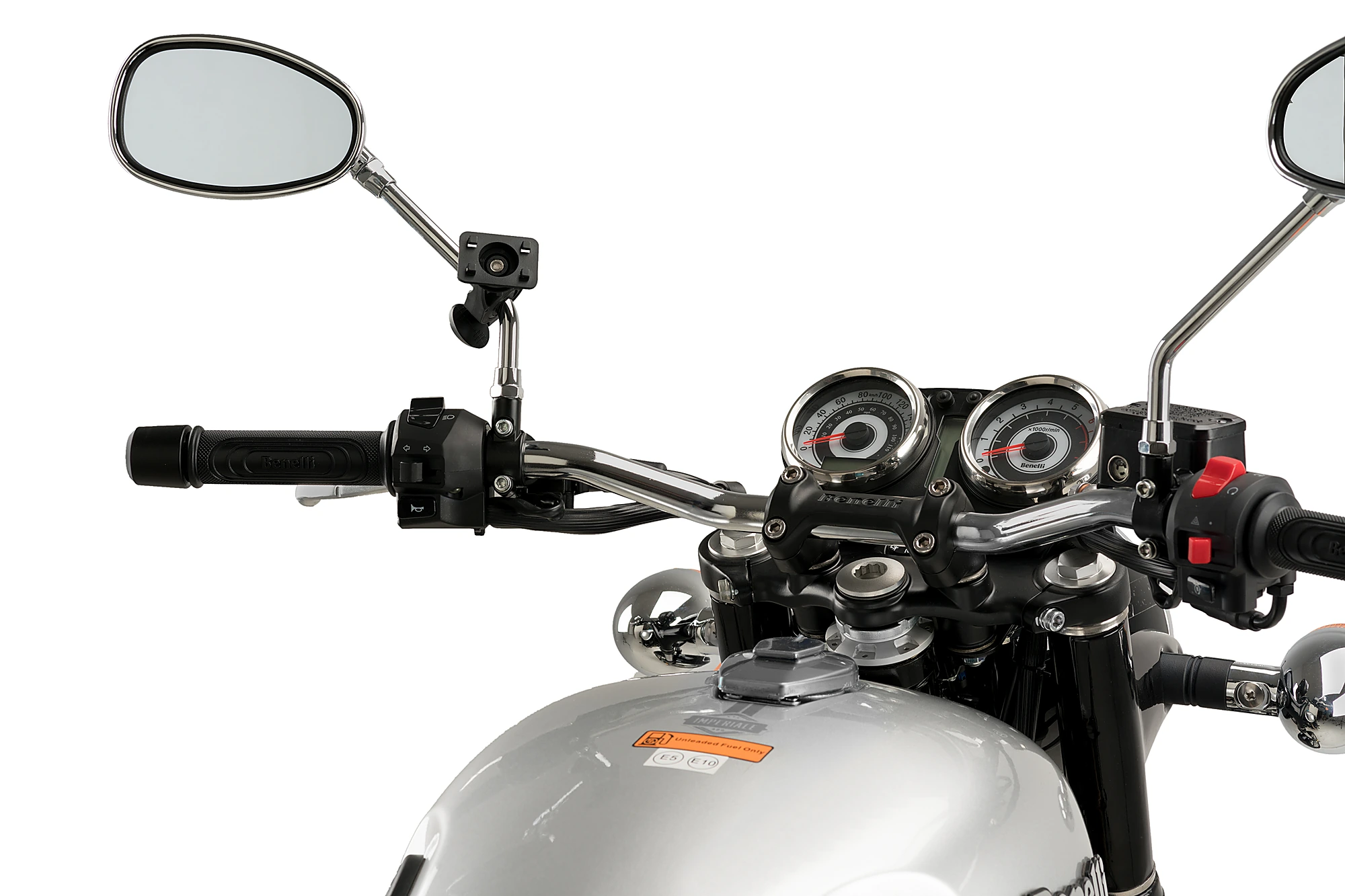 Sie können die Handyhalterung am Sockel des Spiegels, an der Spiegelstange, am Lenker und an der Sattelstütze des Motorrads anbringen. Bei letzterer ist das Handy besser gegen mögliche Stöße oder Schlaglöcher auf der Straße geschützt.
