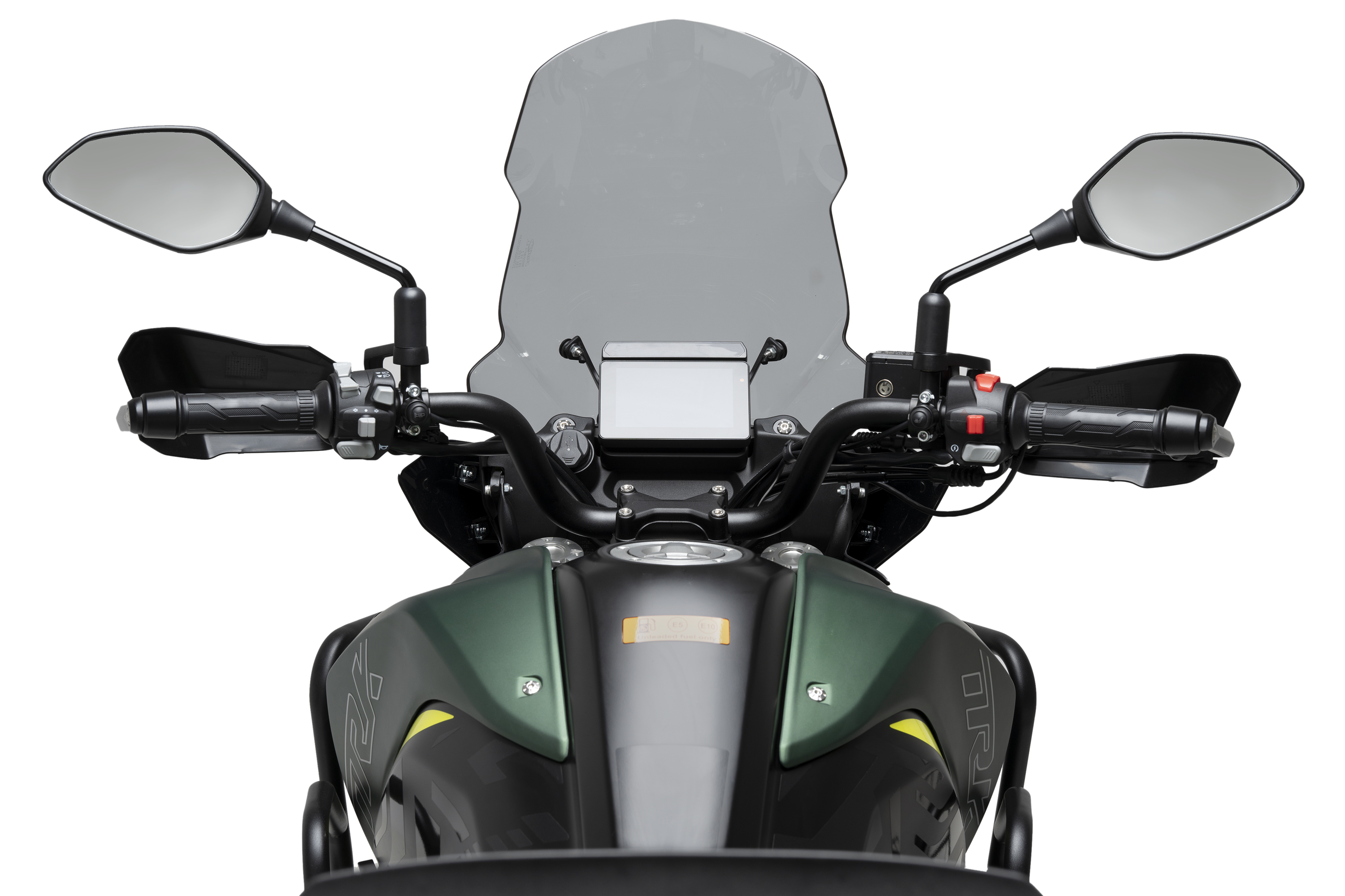 Im unteren Bereich des Bildschirms bleibt das Scheinwerferdesign erhalten und fügt sich perfekt in die Front des Motorrads ein. Diese Oberflächen bleiben bestehen, bis ein größerer Schutz erreicht wird, wobei die Einschränkungen hinsichtlich der Drehung des Lenkers zu berücksichtigen sind.