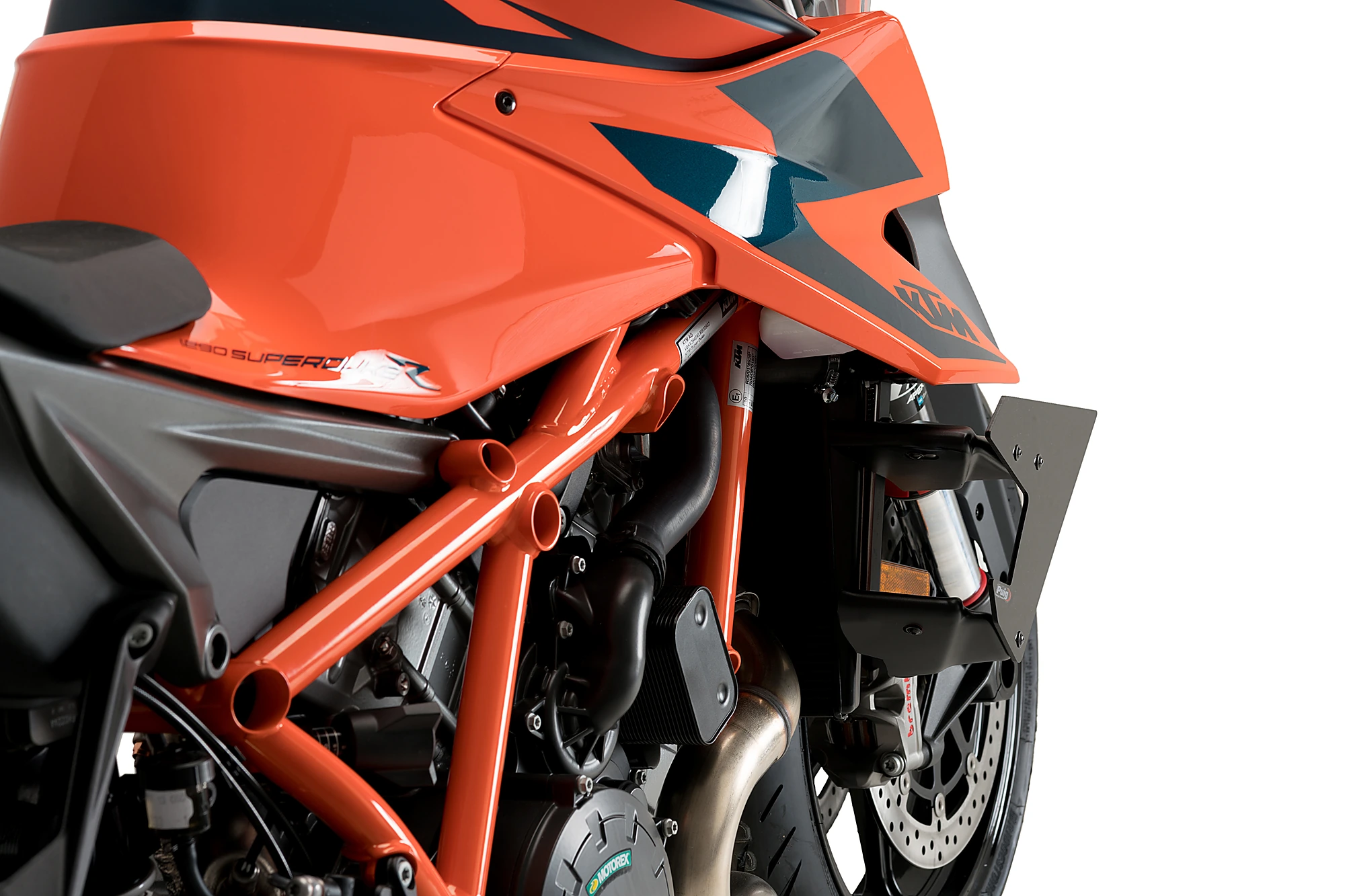 Einerseits aus den zwei Spoilern, die windschnittig geformt sind, diese setzten sich zusammen und bilden den Hauptteil des Motorschutzes. Dieser wurde auf das Gründlichste erforscht, um ein die beste aerodynamische Effizienz zu erreichen. Der Motorspoiler passt sich perfekt an den Kühler Ihrer KTM an, erzeugt dabei einen Abtrieb auf die Vorderachse und schafft so mehr Halt und Stabilität bei Bremsmanövern und erzielt auch noch einen Anti-Wheelie-Effekt.