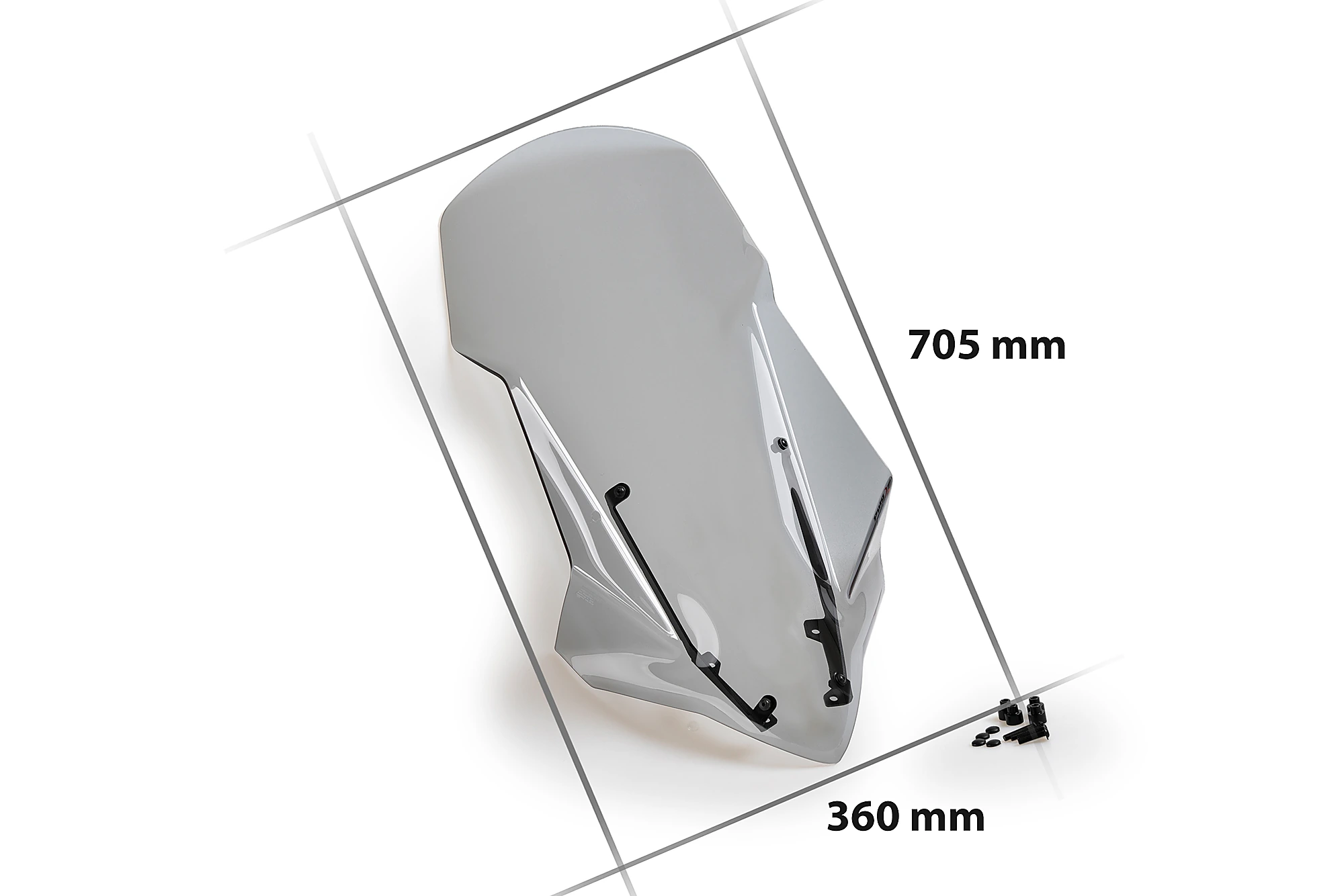 Entworfen und hergestellt in Barcelona von Experten für Aerodynamik aus Puig mit mehr als fünfzig Jahren Erfahrung in der Branche. Es besteht aus hochwertigem 4 mm dickem Acrylmaterial mit den besten Technologien, um ein leichtes, stoß- und kratzfestes Stück mit hervorragender Transparenz zu erhalten. Seine 4 mm abgerundete Kontur erhöht die Sicherheit und entspricht den anspruchsvollsten Vorschriften wie dem deutschen TÜV.