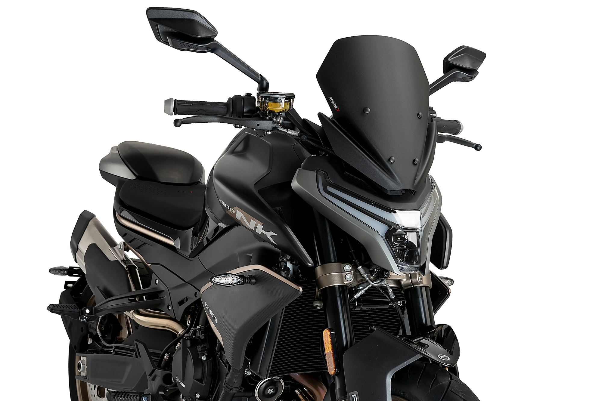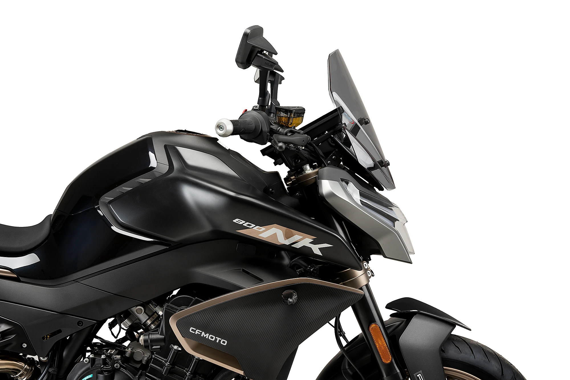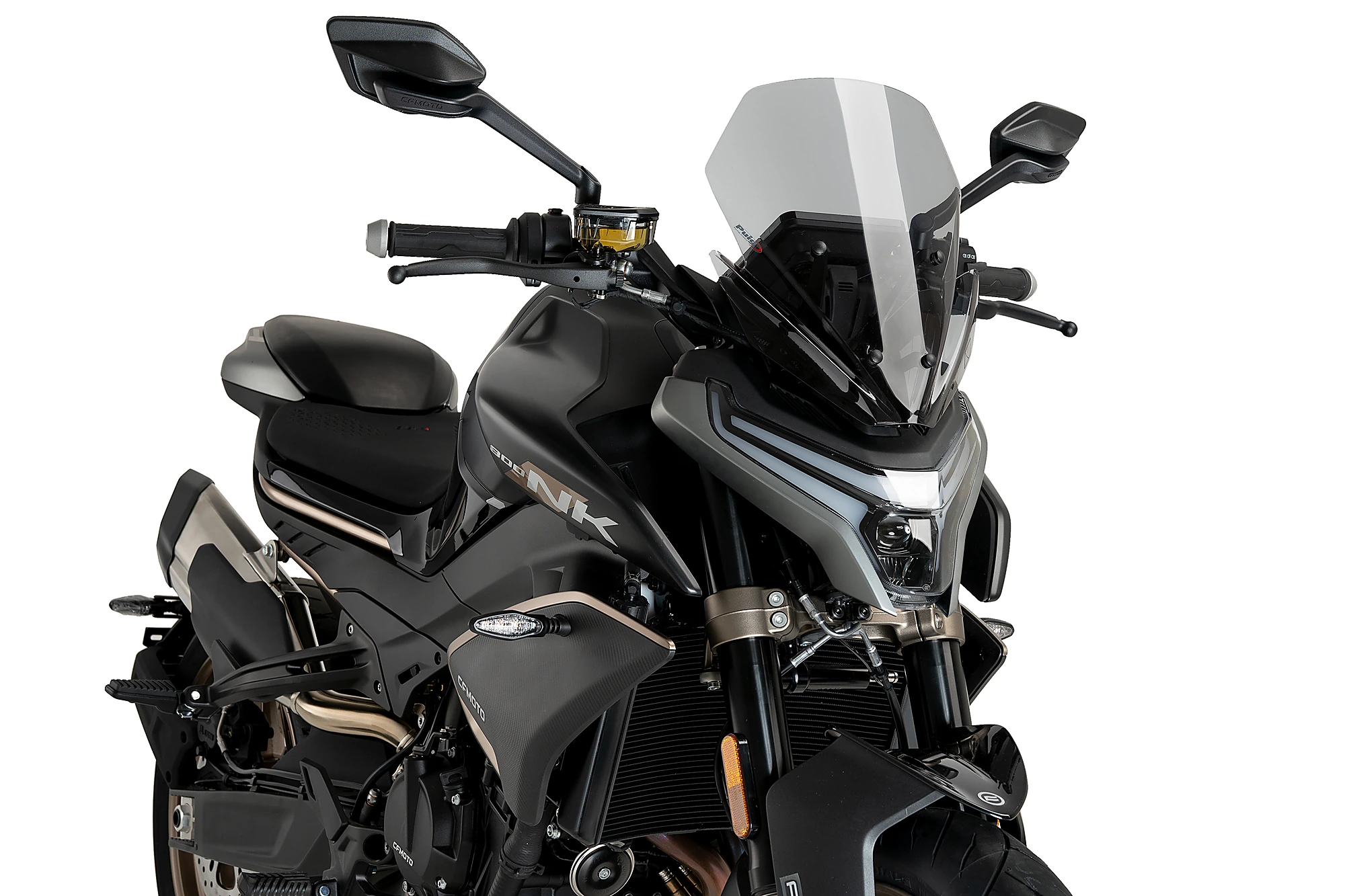 Für einen aggressiveren Look hat Puig die New Generation Sport-Windschutzscheibe für die CF Moto 800NK entworfen: gekennzeichnet durch zwei sehr ausgeprägte Rippen, die sich von der Vorderseite des Motorrads zu den Seiten erstrecken. Das Design dieser Windschutzscheibe deckt vollständig den Bereich des Tachometers ab und passt sich perfekt der Form der Vorderseite an. Die seitlichen Formen sind so konzipiert, dass sie die Luft besser verteilen, die direkt auf die Hände treffen würde, was einen höheren Fahrkomfort und eine spürbare aerodynamische Verbesserung bietet.
