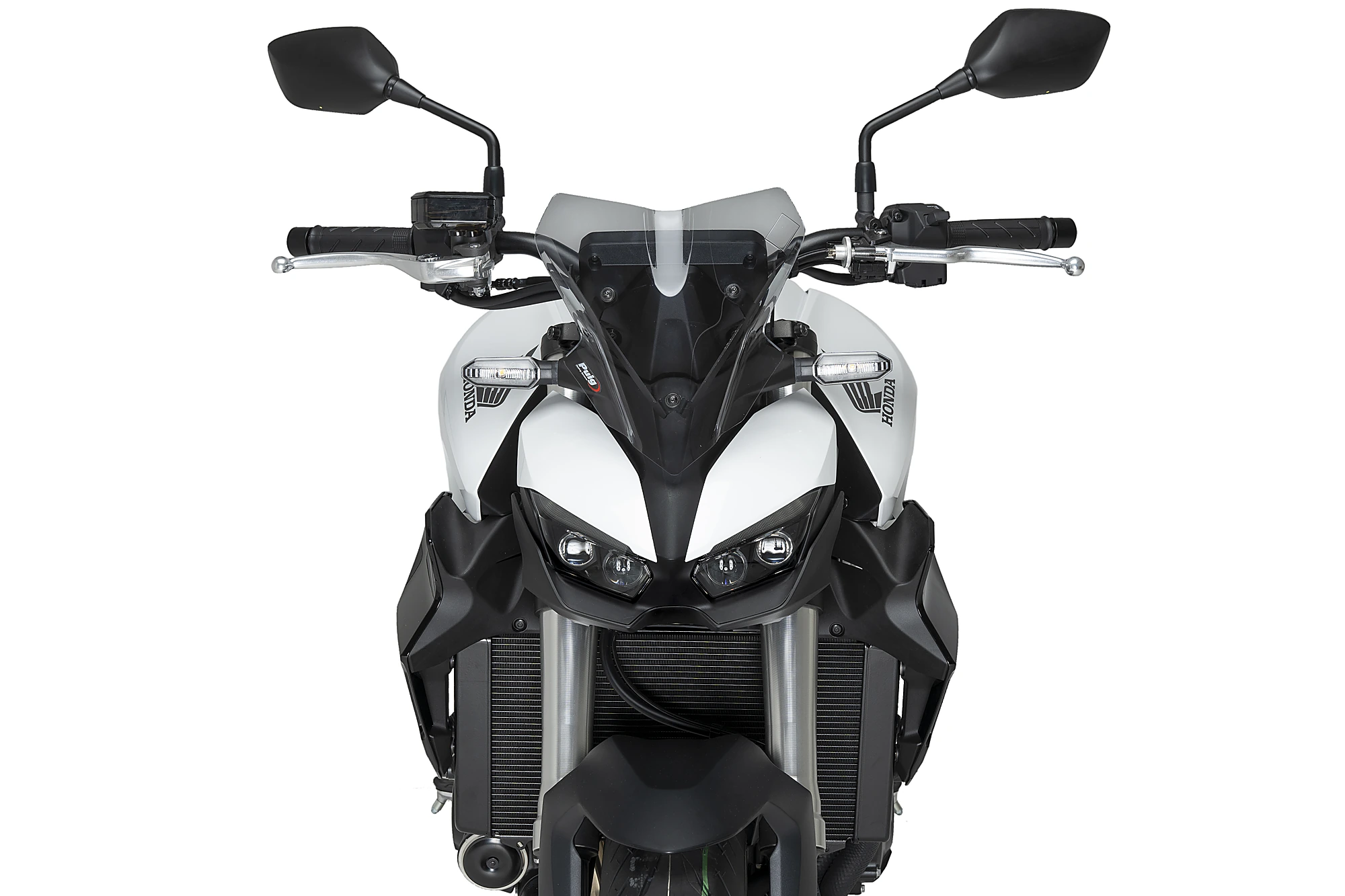 Zwei markante Linien verlaufen mittig über die Scheibe und passen sich visuell der Frontgestaltung der CB1000 Hornet an. Das Spiel mit Formen und Volumen sorgt für eine perfekte optische Verbindung zwischen der Scheibe und der Verkleidung, wodurch der sportliche Charakter des Motorrads verstärkt wird.