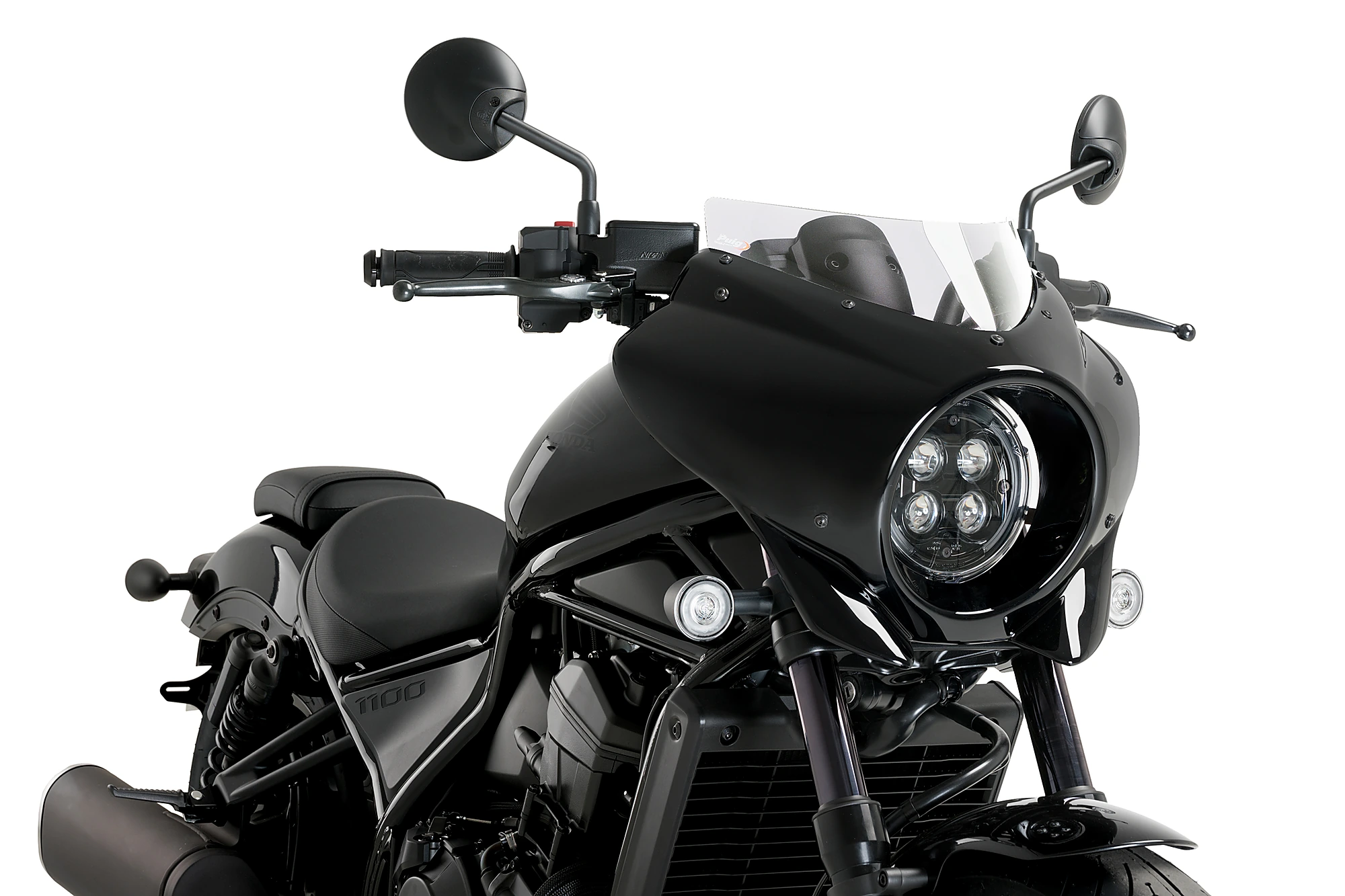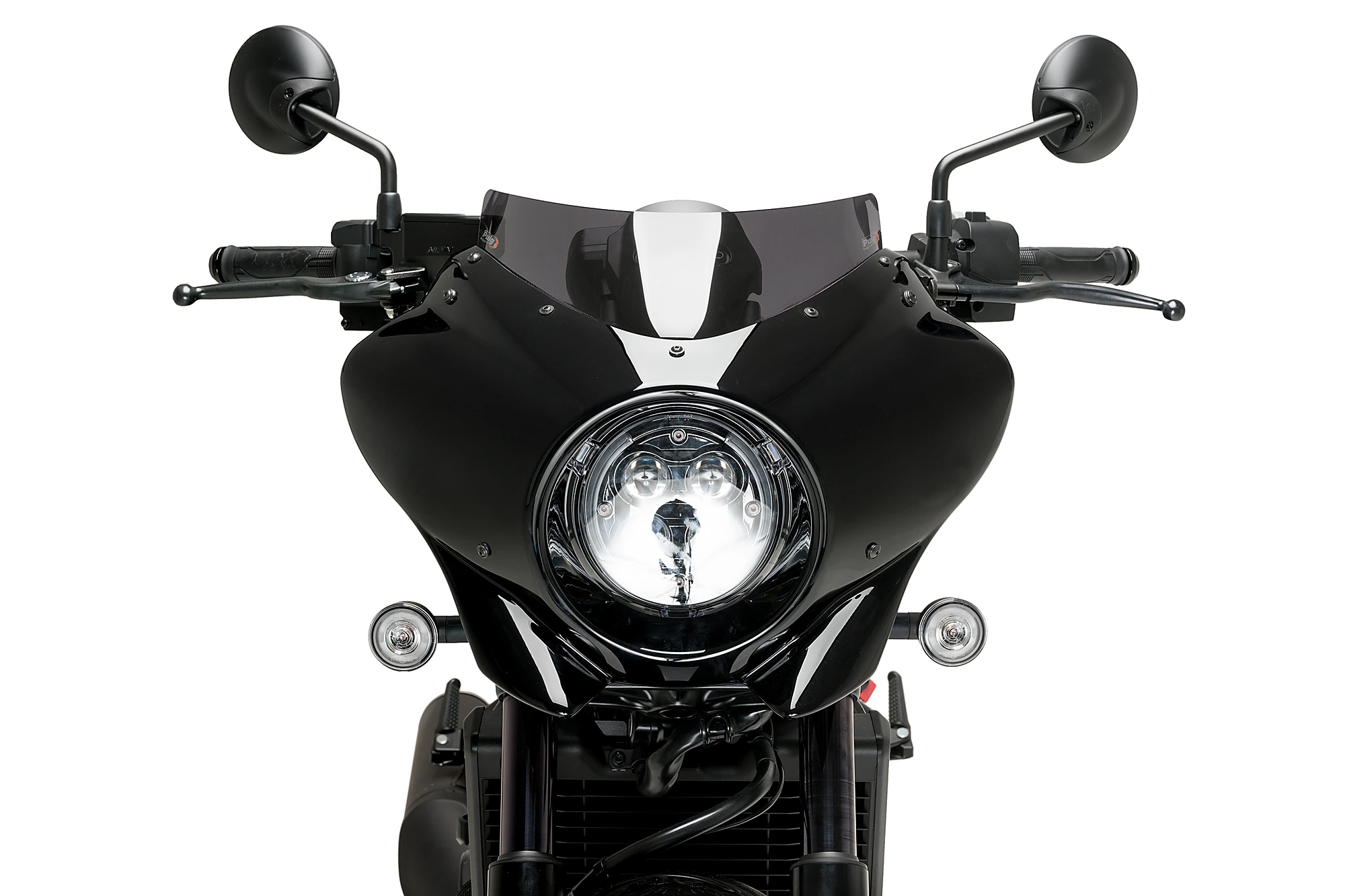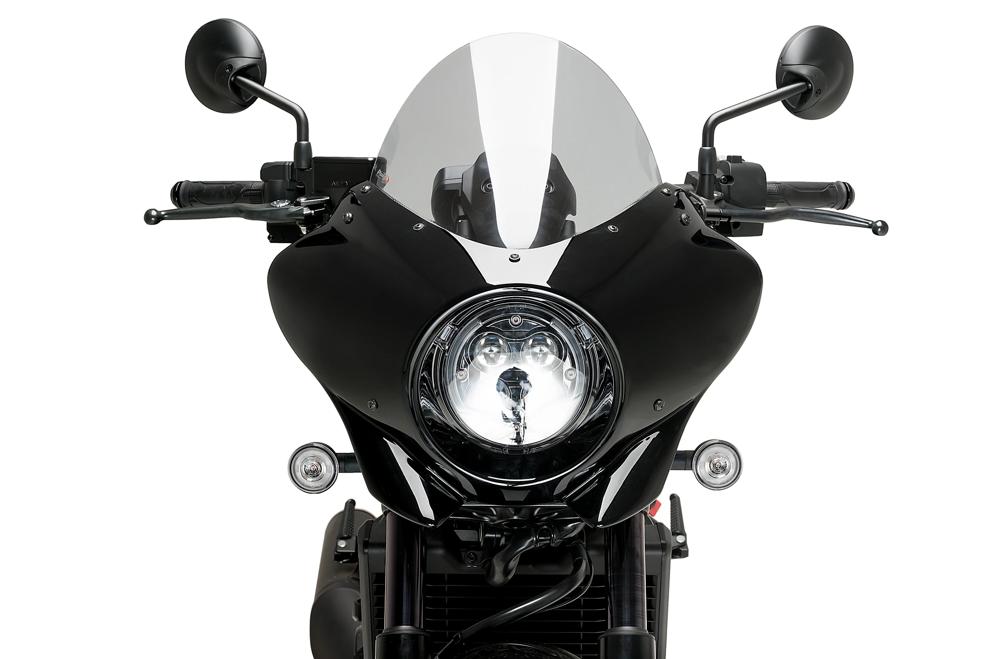 The Mirage semi-fairing is a very universal accessory since its design easily adapts to motorcycles with a round headlight, covering the front part around the headlight, protecting it from dirt and small impacts.