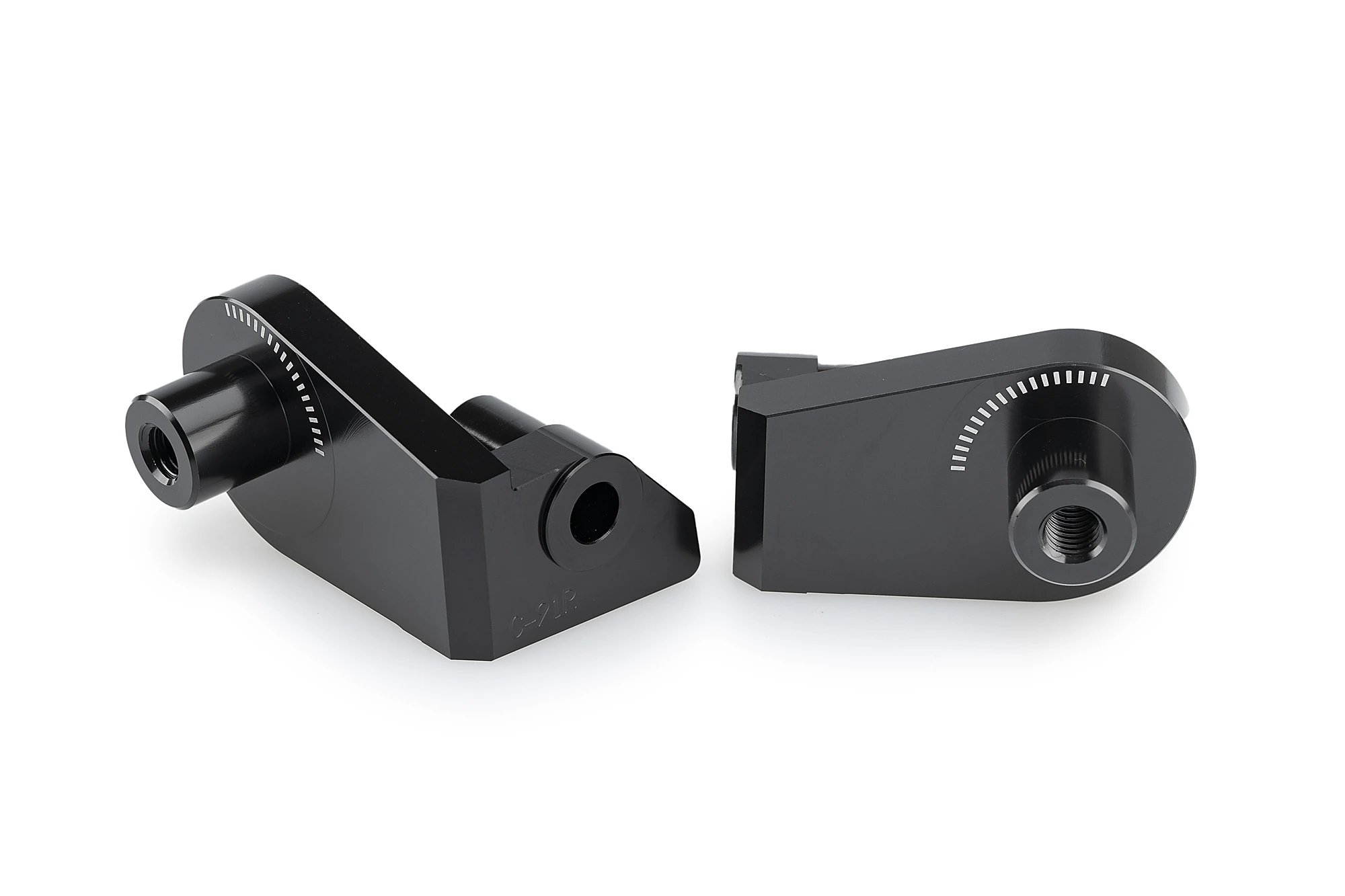 20mm relocation brackets. This offset along with the adjustable footpeg adaptor allows you to move the footpeg relative to the original position in a 20mm radius and at 15 degrees intervals.