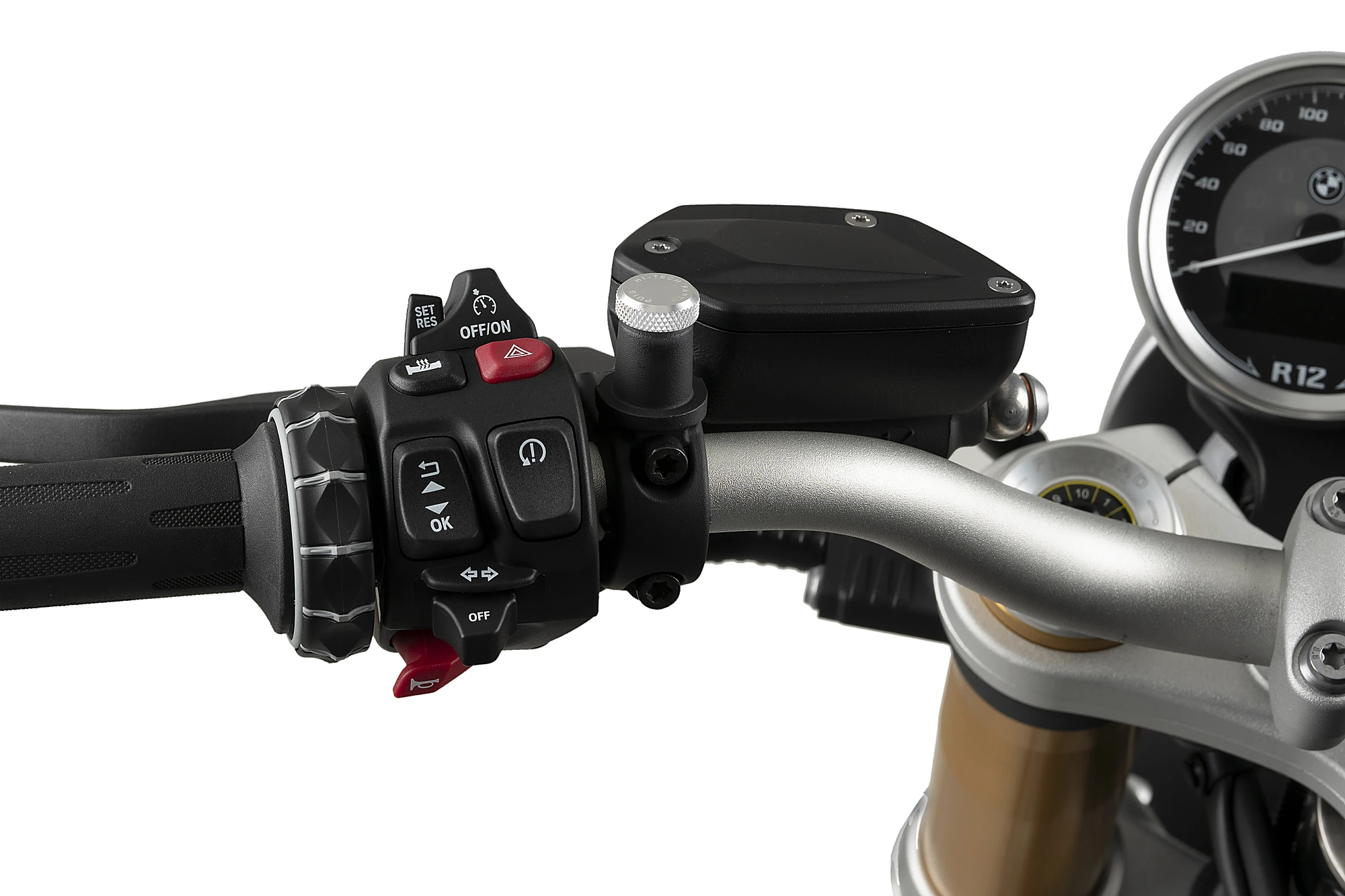 Decorative function: Covers the threaded holes of the handlebar mirror support.