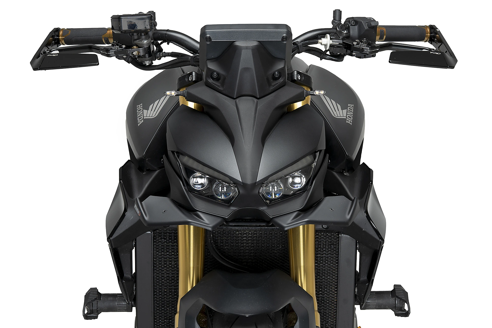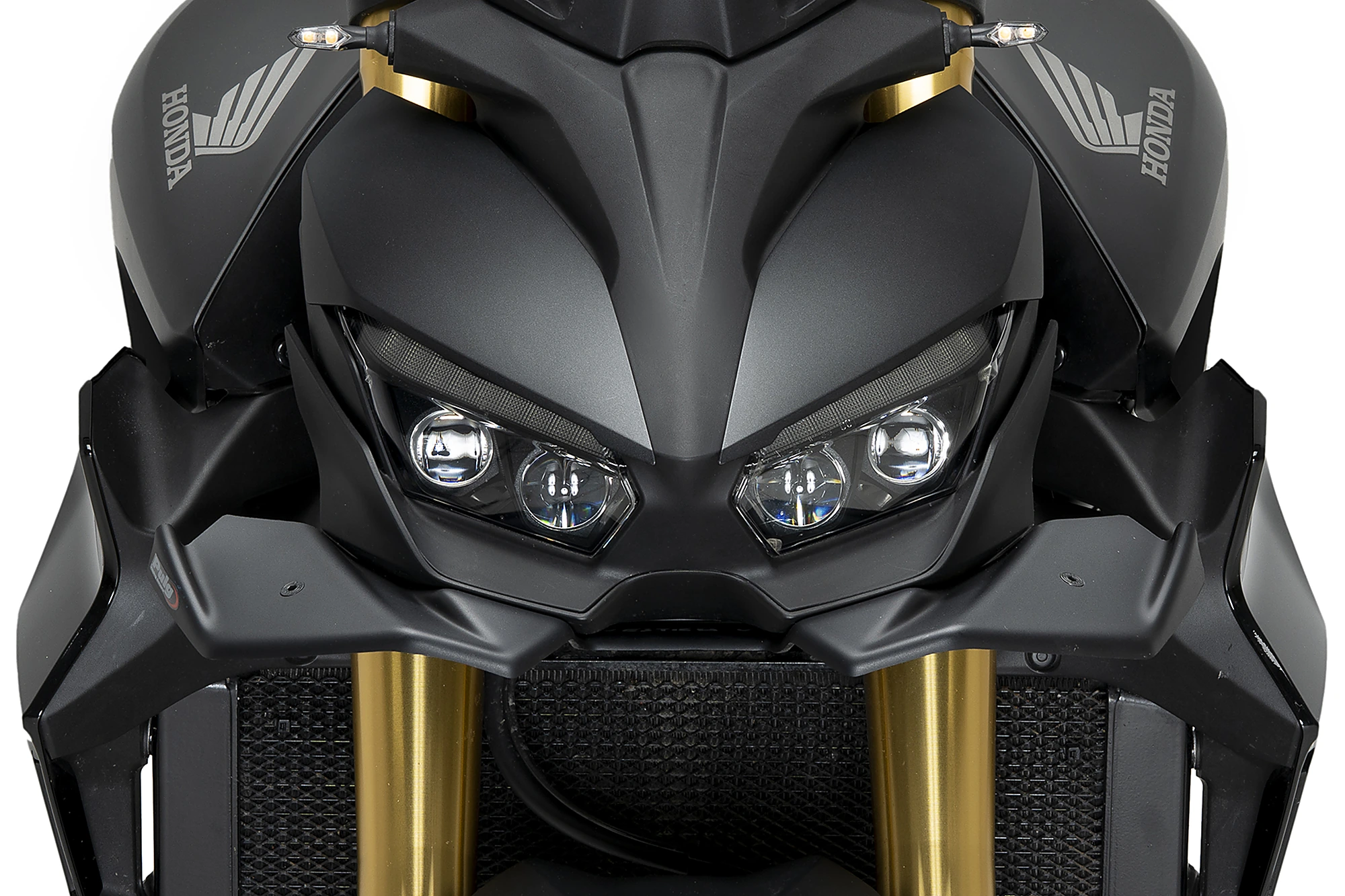 Directly inspired by the winglets used in MotoGP, the front wing for the Honda CB1000 Hornet 2025 has been developed to enhance aerodynamic performance without compromising an aggressive look perfectly integrated into the motorcycle. Its wide wing surfaces reinforce the visual width of the front end, enhancing the Hornet’s sporty character and highlighting its original lines.
