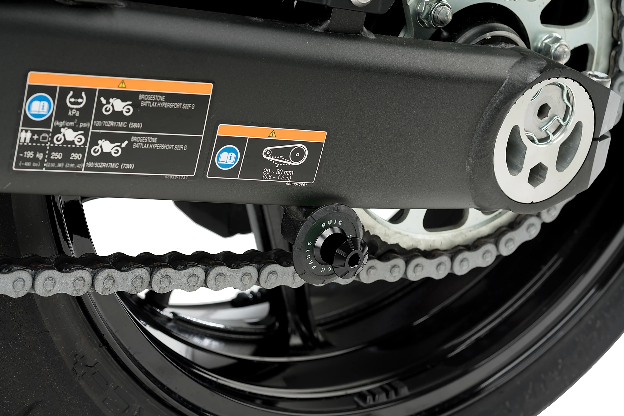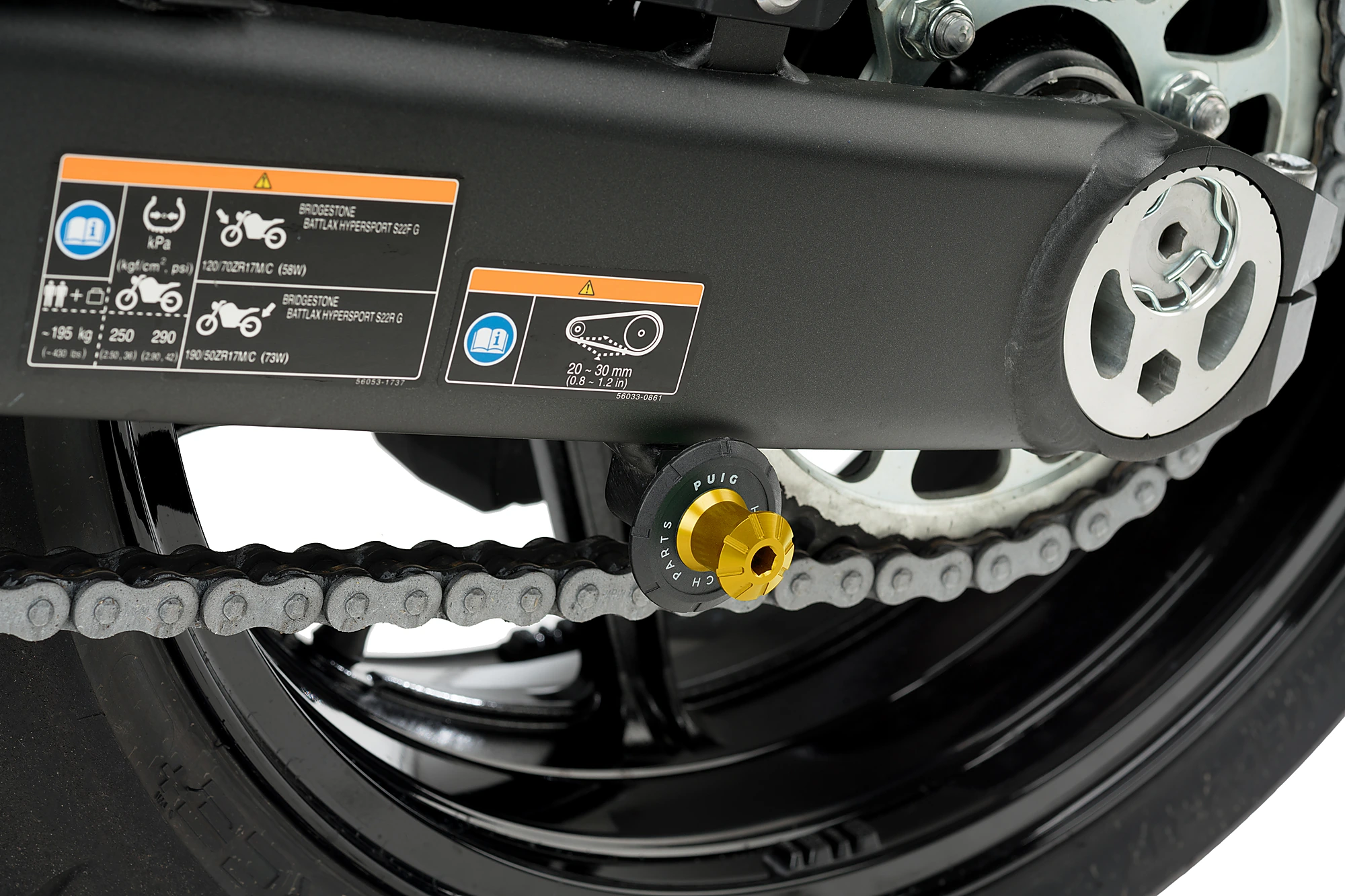 Spools work as a guide to fit a stand and easily raise your motorcycle, quickly and safely. In this case, we present the Spool Pro by Puig. Manufactured from an anodized aluminium billet (reduced weight of 32 gr), it will guarantee the protection of the swingarm from possible scratches thanks to the fact that it comes with a black nylon washer with the Puig Hi-Tech Parts etched on it.
