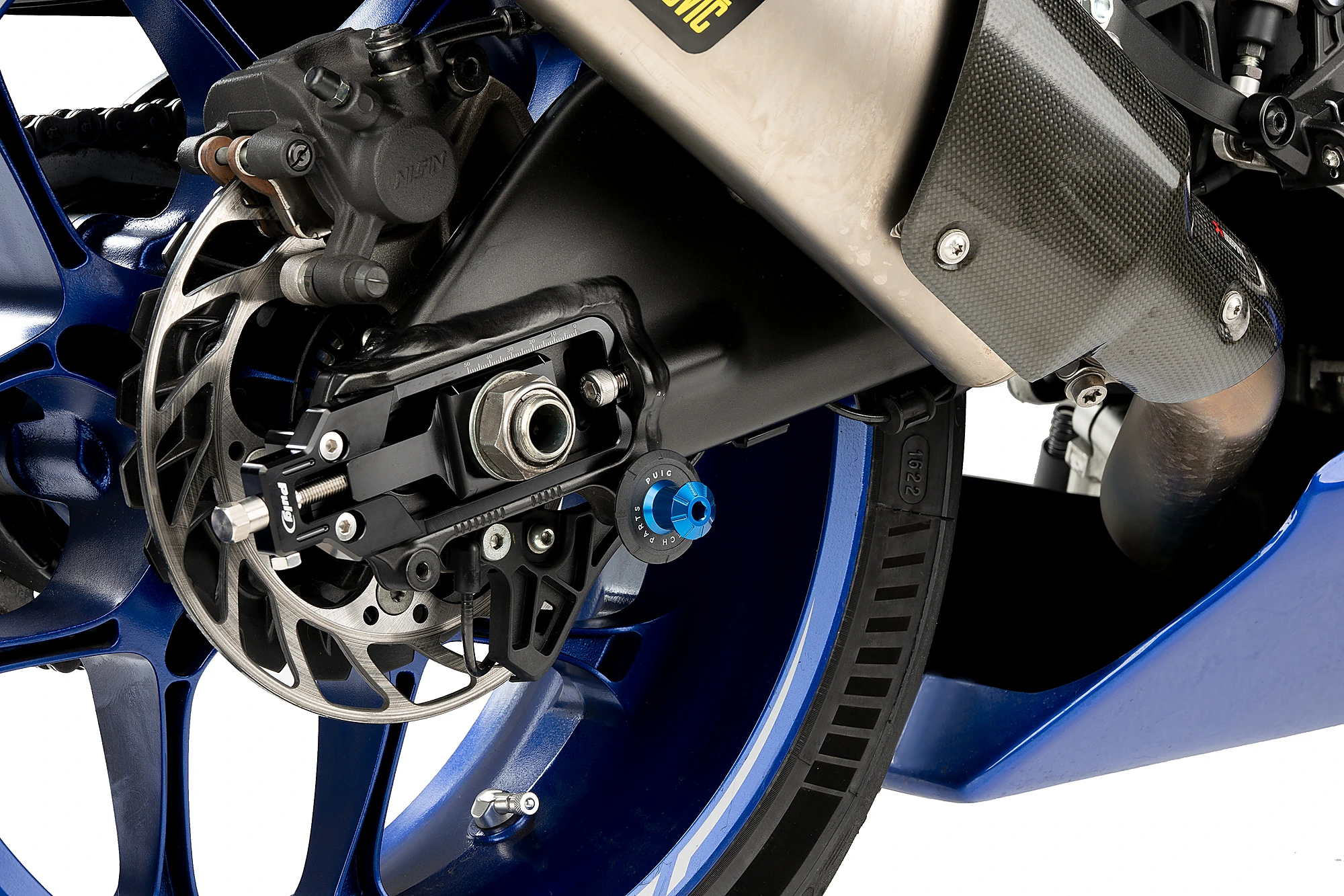 Spools work as a guide to fit a stand and easily raise your motorcycle, quickly and safely. In this case, we present the Spool Pro by Puig. Manufactured from an anodized aluminium billet (reduced weight of 32 gr), it will guarantee the protection of the swingarm from possible scratches thanks to the fact that it comes with a black nylon washer with the Puig Hi-Tech Parts etched on it.