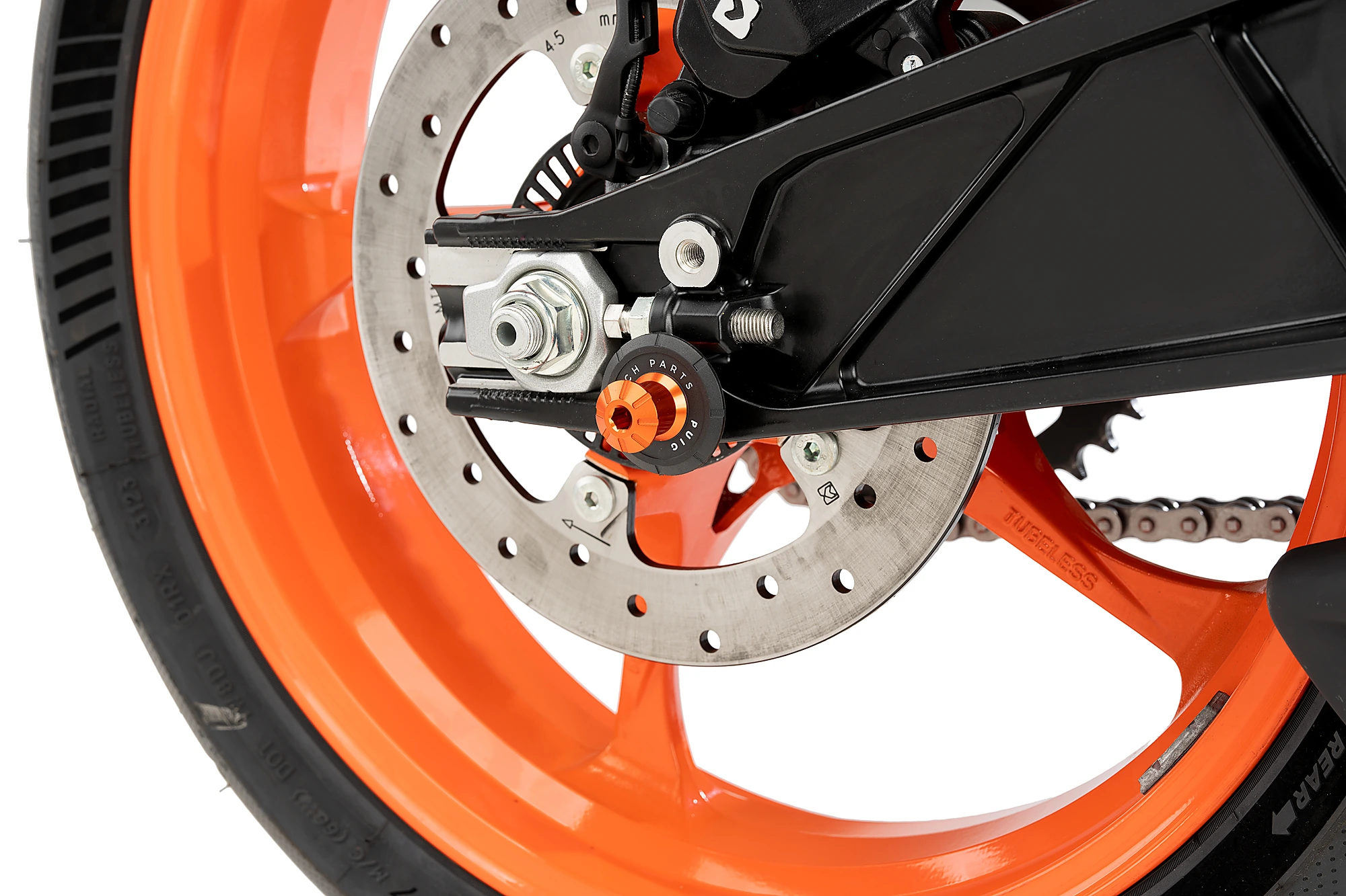 The swingarm is protected by the incorporation of the nylon washer.
