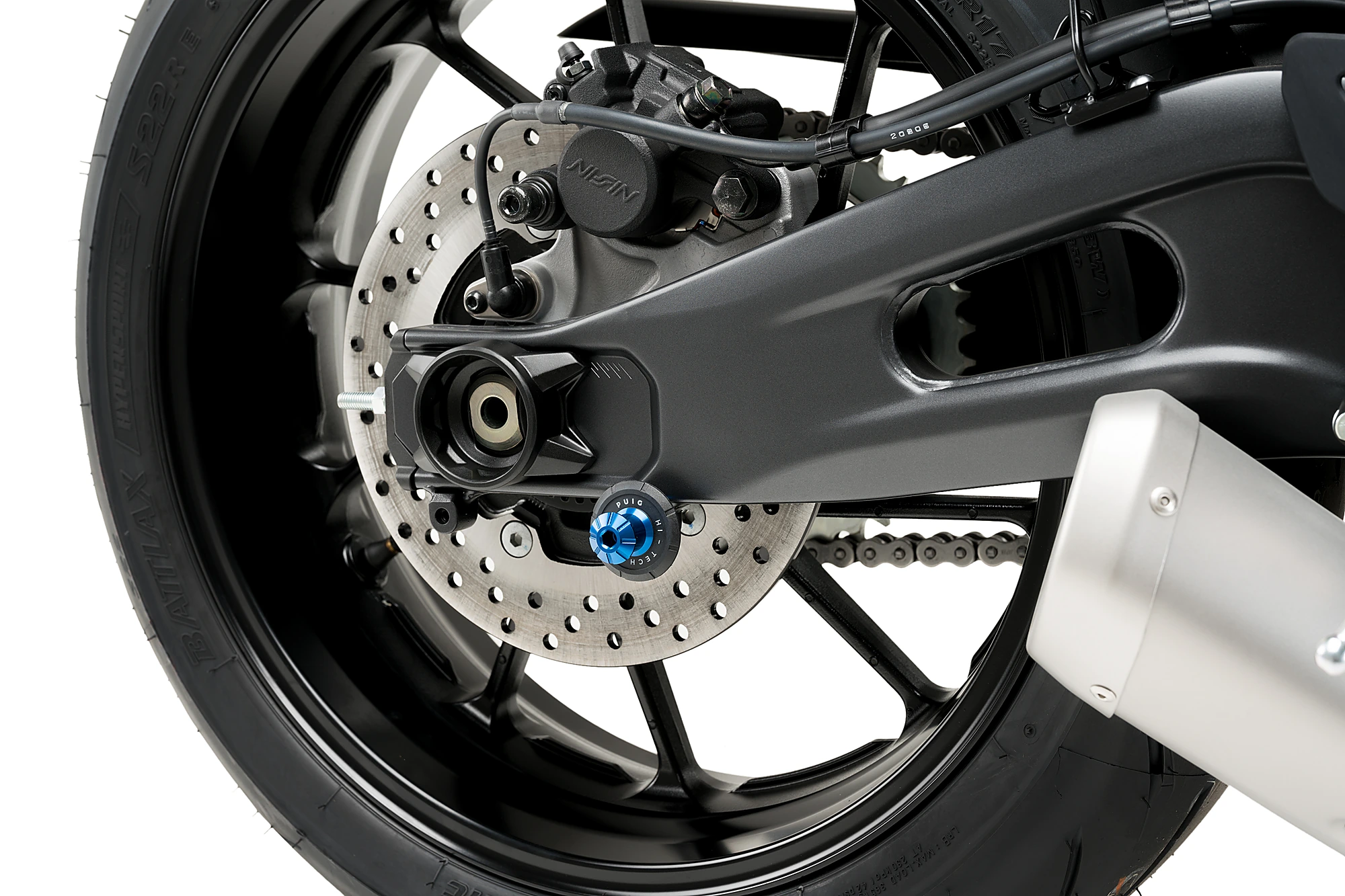 The swingarm is protected by the incorporation of the nylon washer.