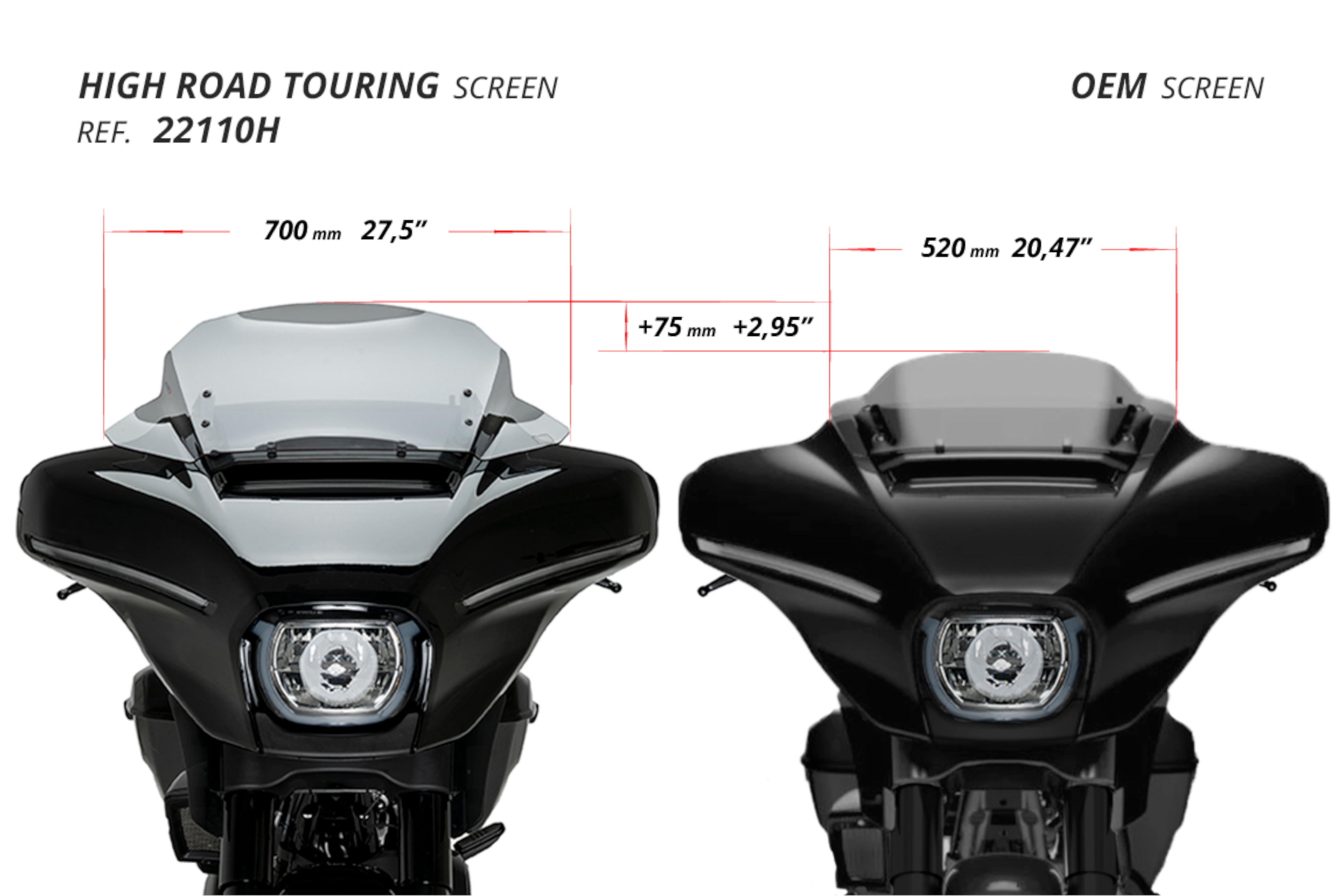 Two versions are available, Sport and Touring, with a height of 223 mm and 323 mm respectively, so that each rider can choose the High Road screen that best suits their needs. Some motorcycle models only have one version.