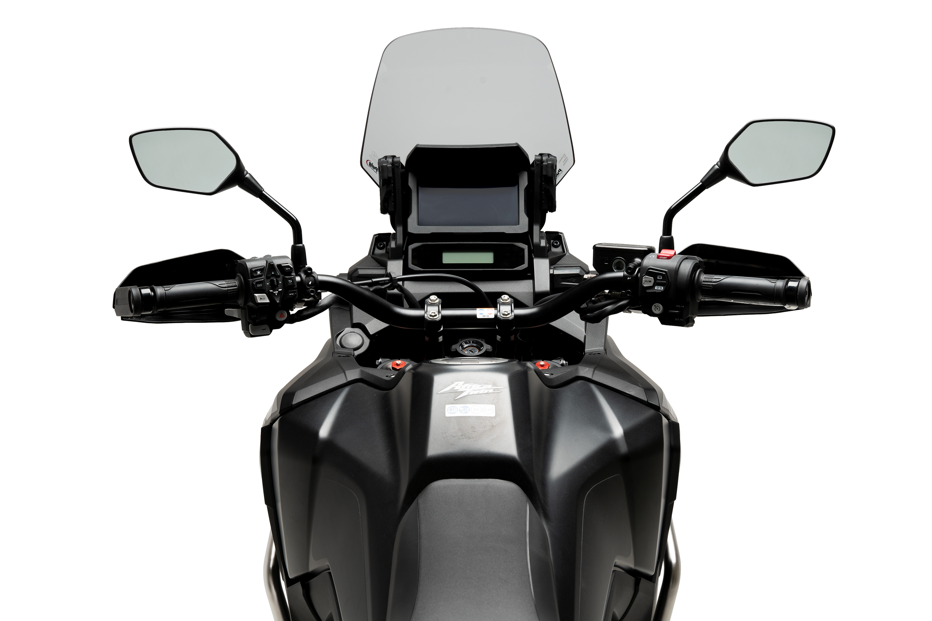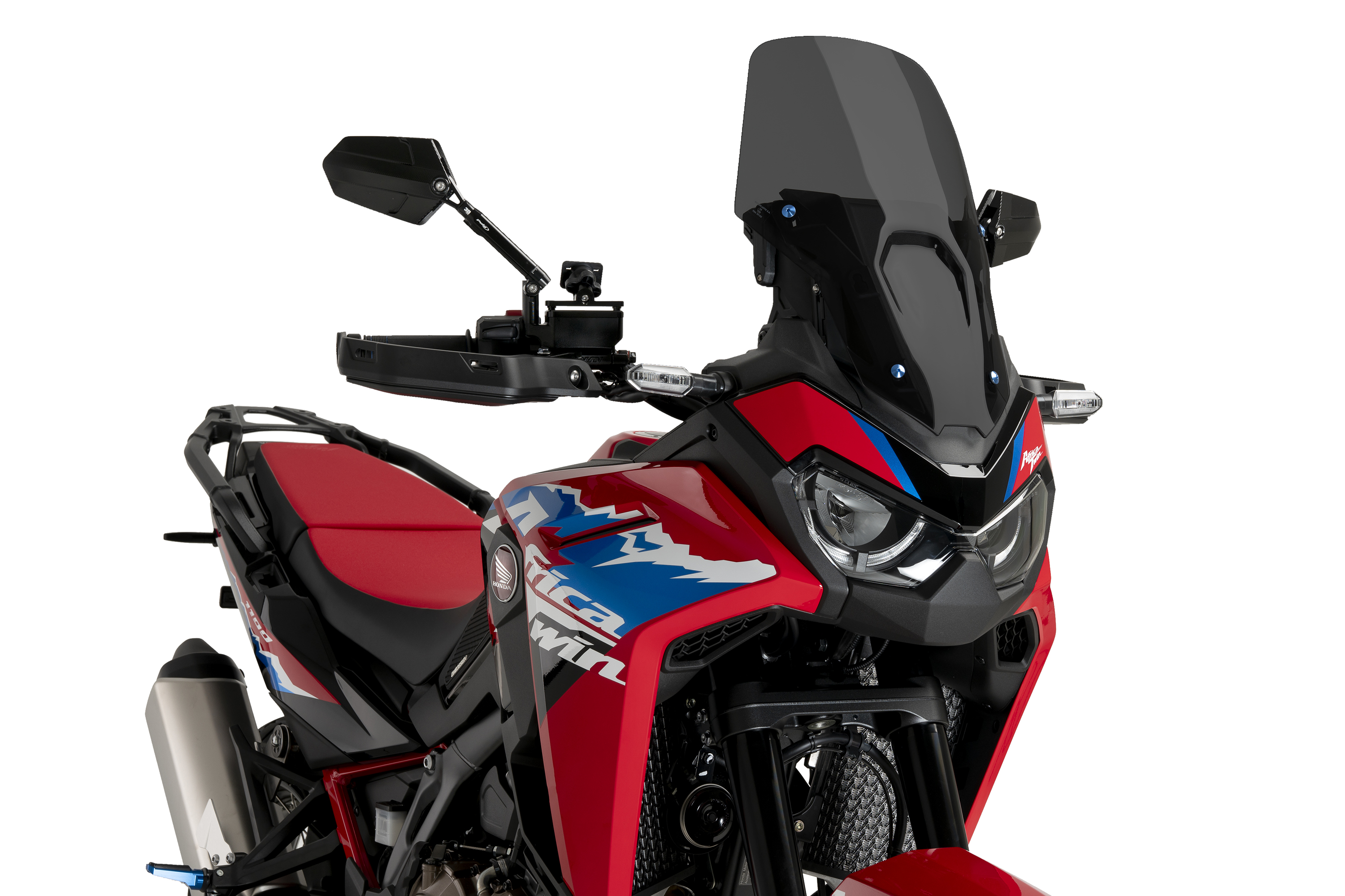 Designed specifically for the Honda Africa Twin Adventure Sports 20'-, the Puig Touring screen has larger dimensions compared to the original screen, and together with its studied shapes it increases the rider's aerodynamic protection and the sensation of comfort when diverting effectively the air that would impact against the rider, avoiding annoying noises and turbulence. At the same time it offers a clear field of vision, making it optimal for long trips, tall riders or riding in adverse weather conditions.