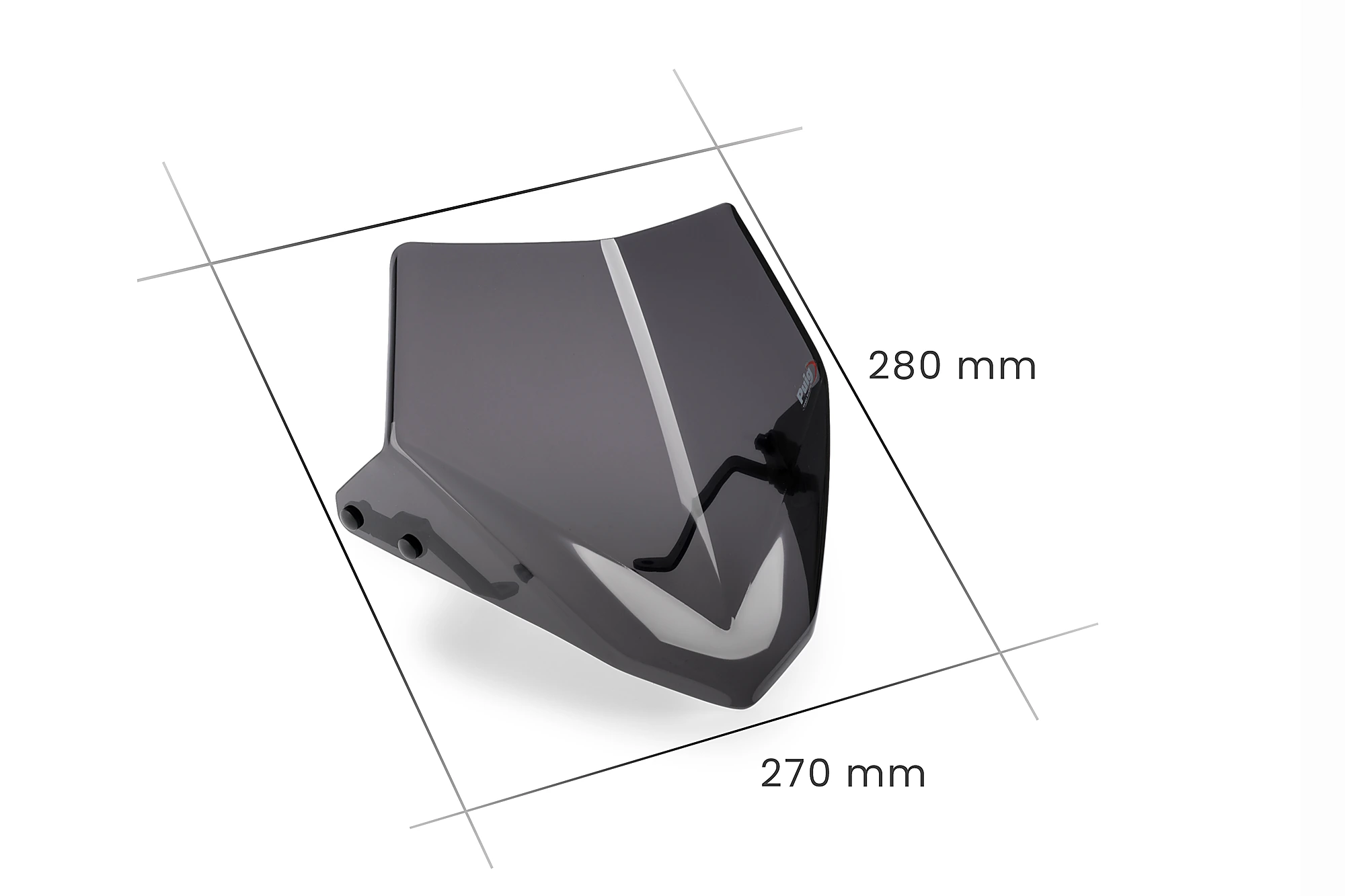 Measuring 270 mm wide by 280 mm high, the Puig NG Sport screen adapts to the motorcycle by means of high-quality metal supports finished in a discreet textured black colour. Light and resistant, they have a design according to the aesthetics of the set.
