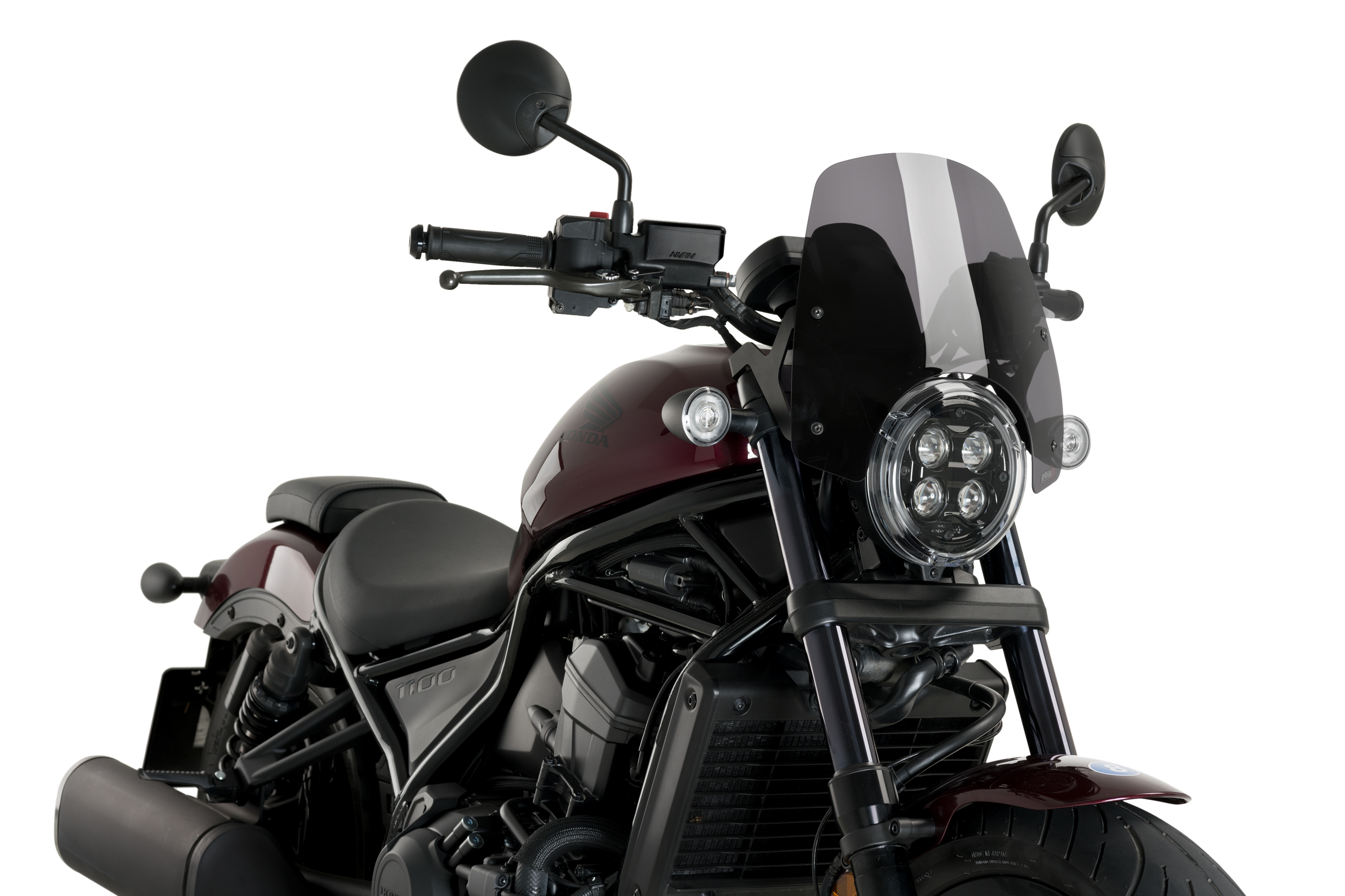 Improve the touring capabilities of the Honda Rebel with the Sport windshield from Puig. In addition to providing better aerodynamic protection against wind and rain, it gives the bike a sport and personalized look.