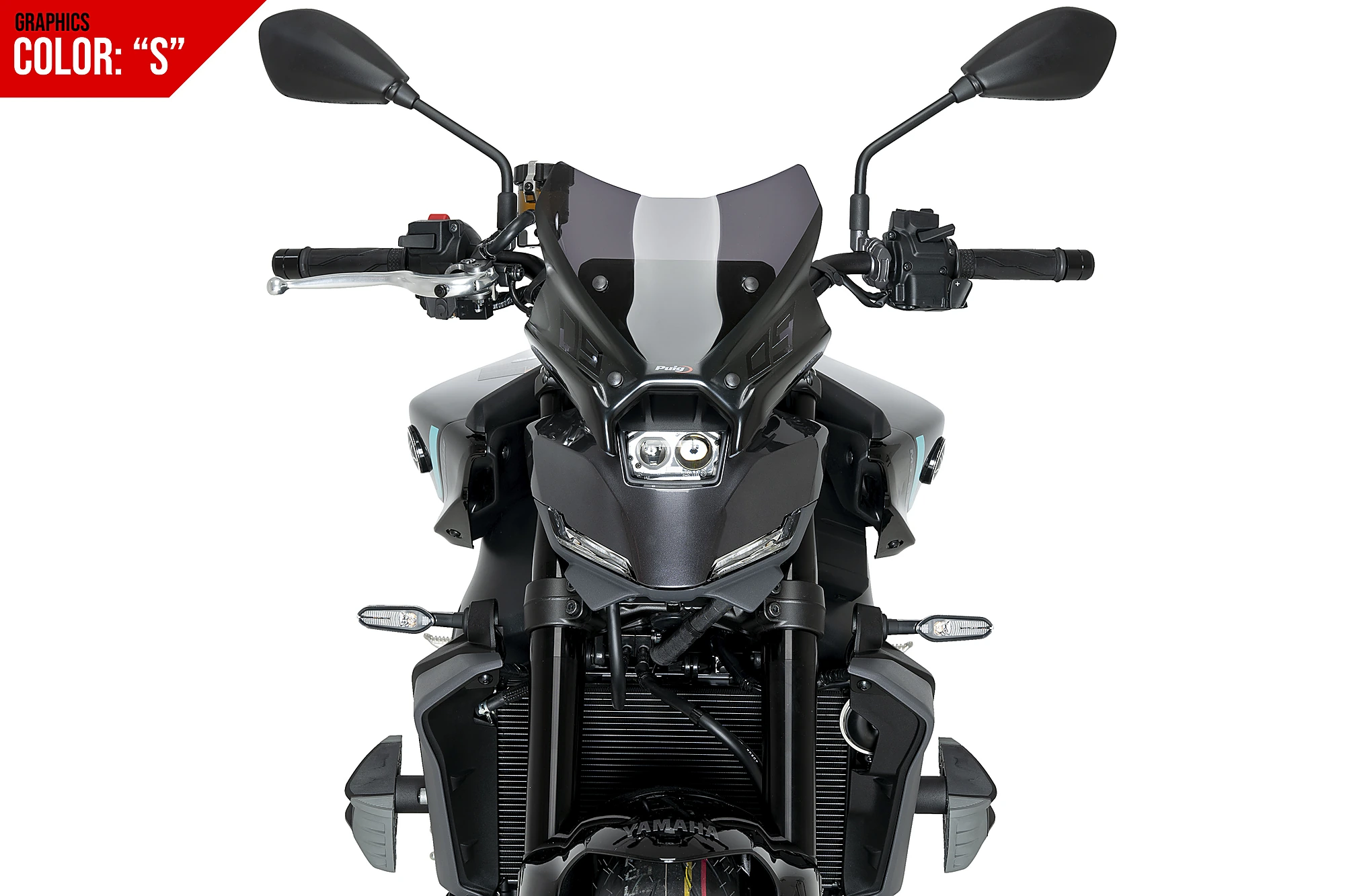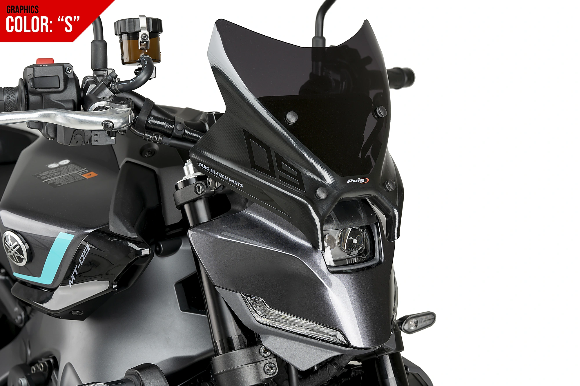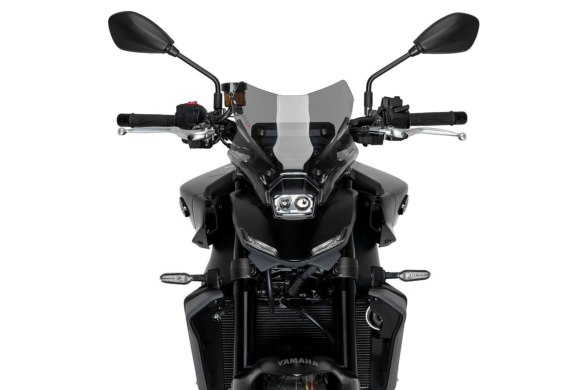 The side shapes form lateral channels to divert air and thereby improve the motorcycle's aerodynamics. The bottom part ideally adapts to the lines of the headlight, intensifying its aggressiveness and achieving a distinctive front for your MT-09.