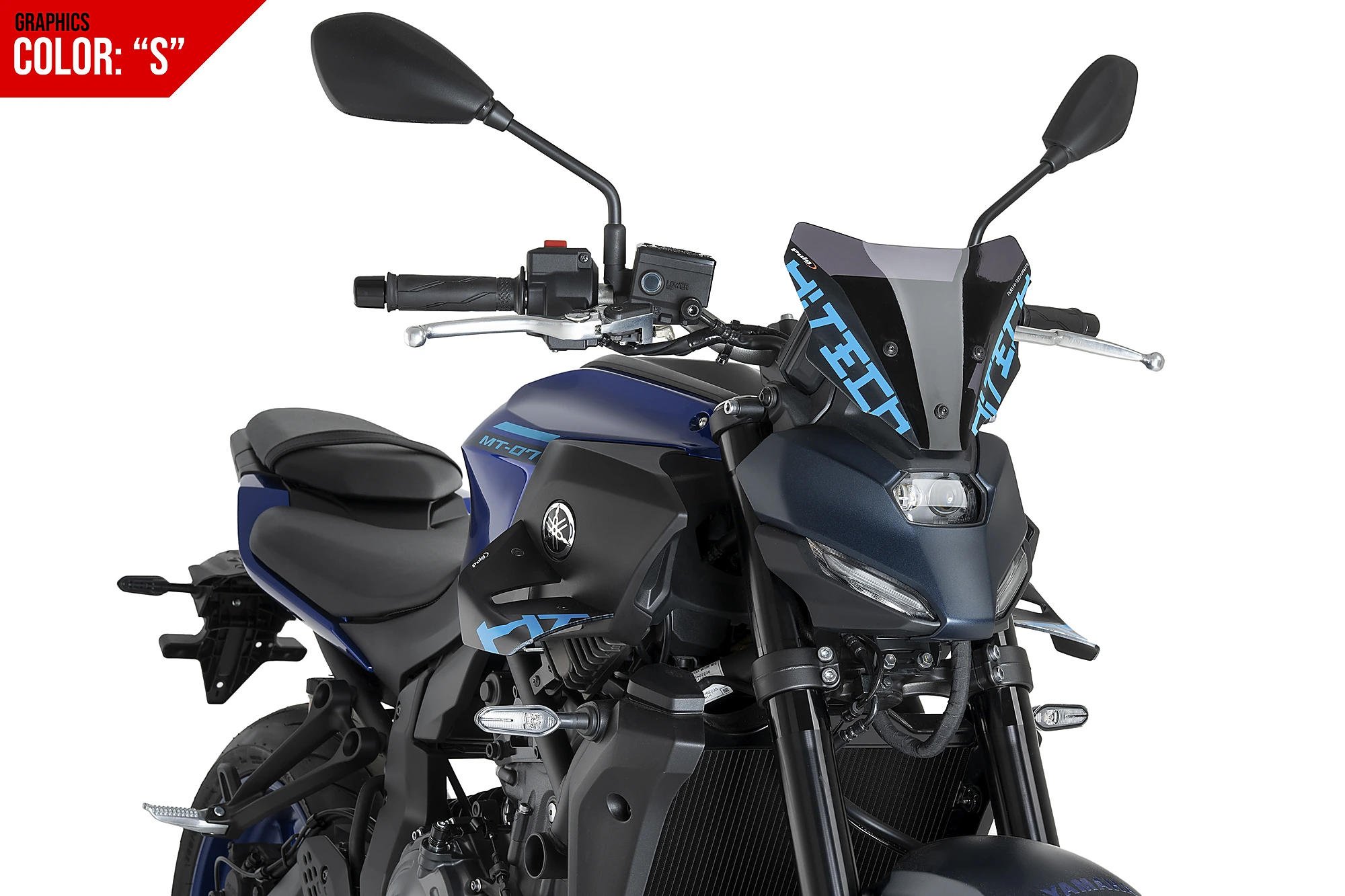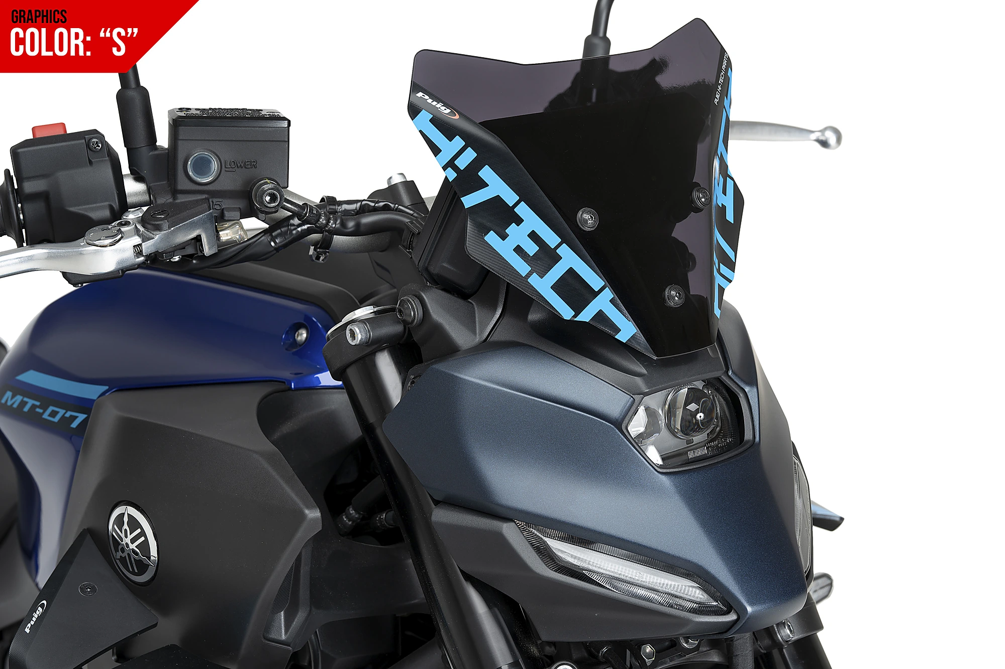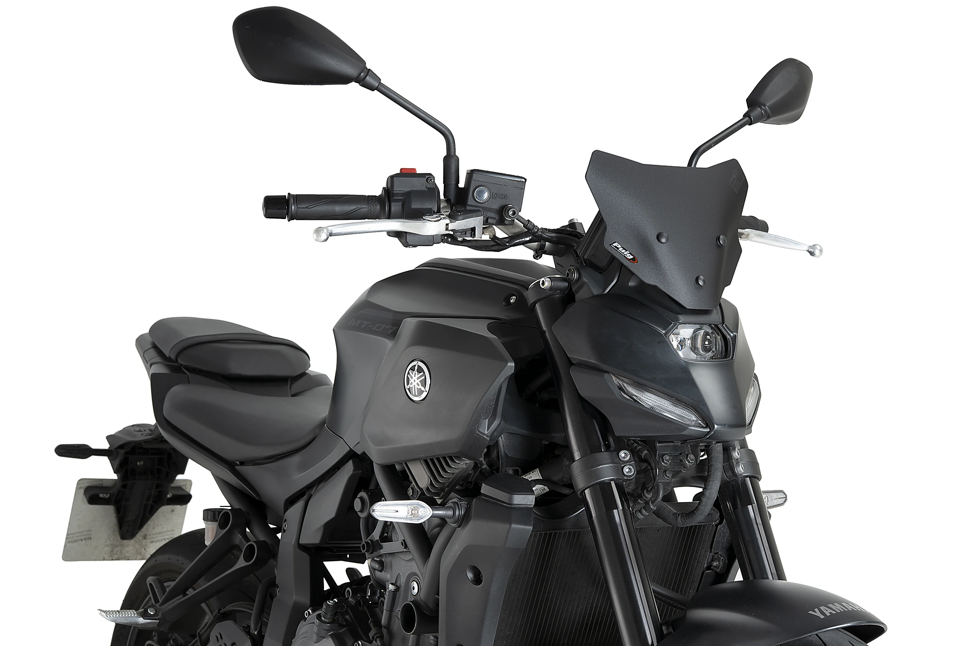Enhance the aggressive and sporty aesthetics of your YAMAHA MT-07, the best-selling middleweight naked bike, with Puig's NG Sport windshield. Inspired by the aerodynamic shapes of fighter jets, this windshield offers perfect integration with the new front design of the MT-07, resulting in a sharper, more dynamic, and modern look.