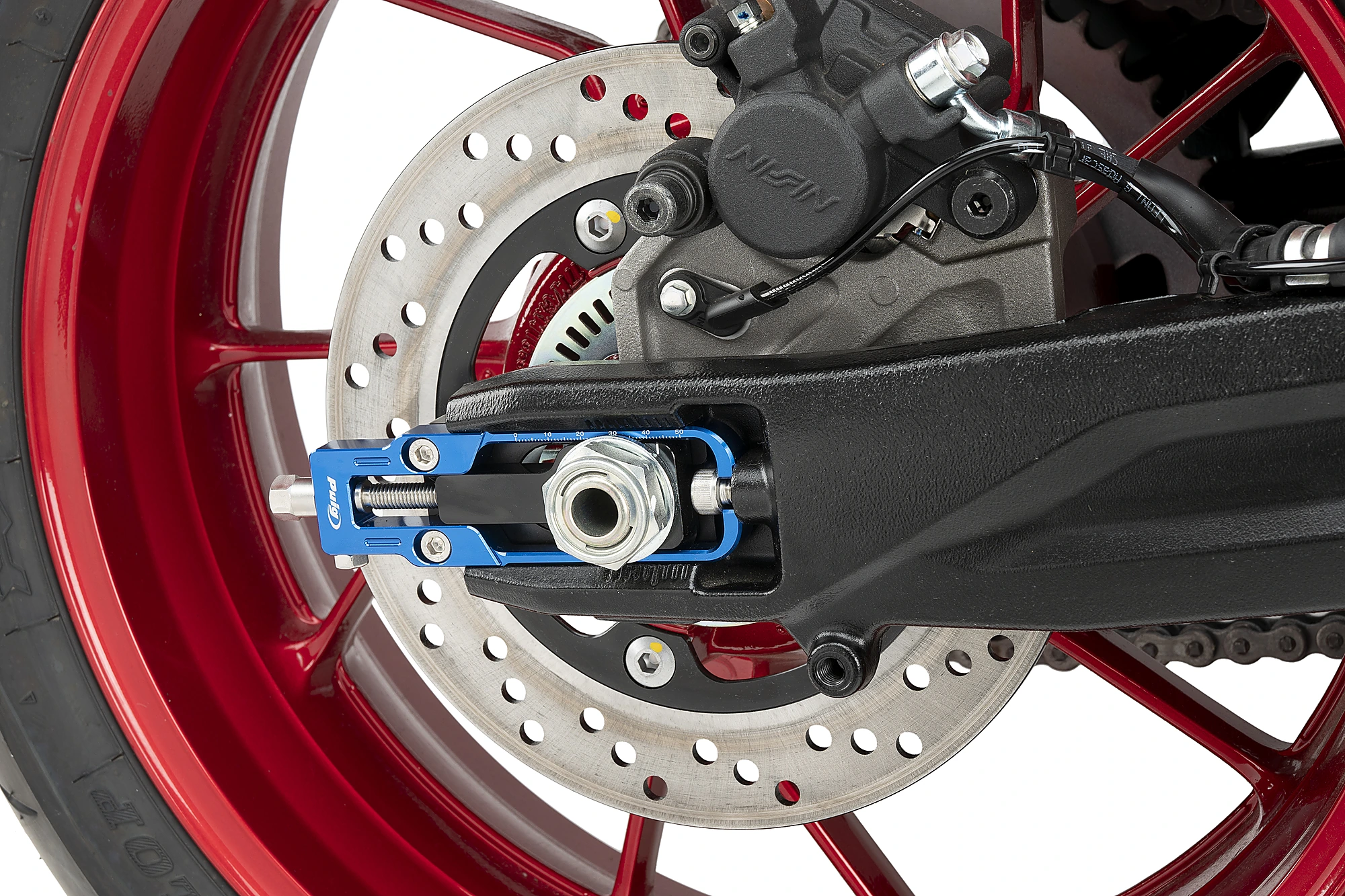 Se integra perfectamente en el hueco del basculante de cada moto, y su anodizado en una combinación de colores permite escoger la opción que mejor queda estéticamente con nuestra moto.