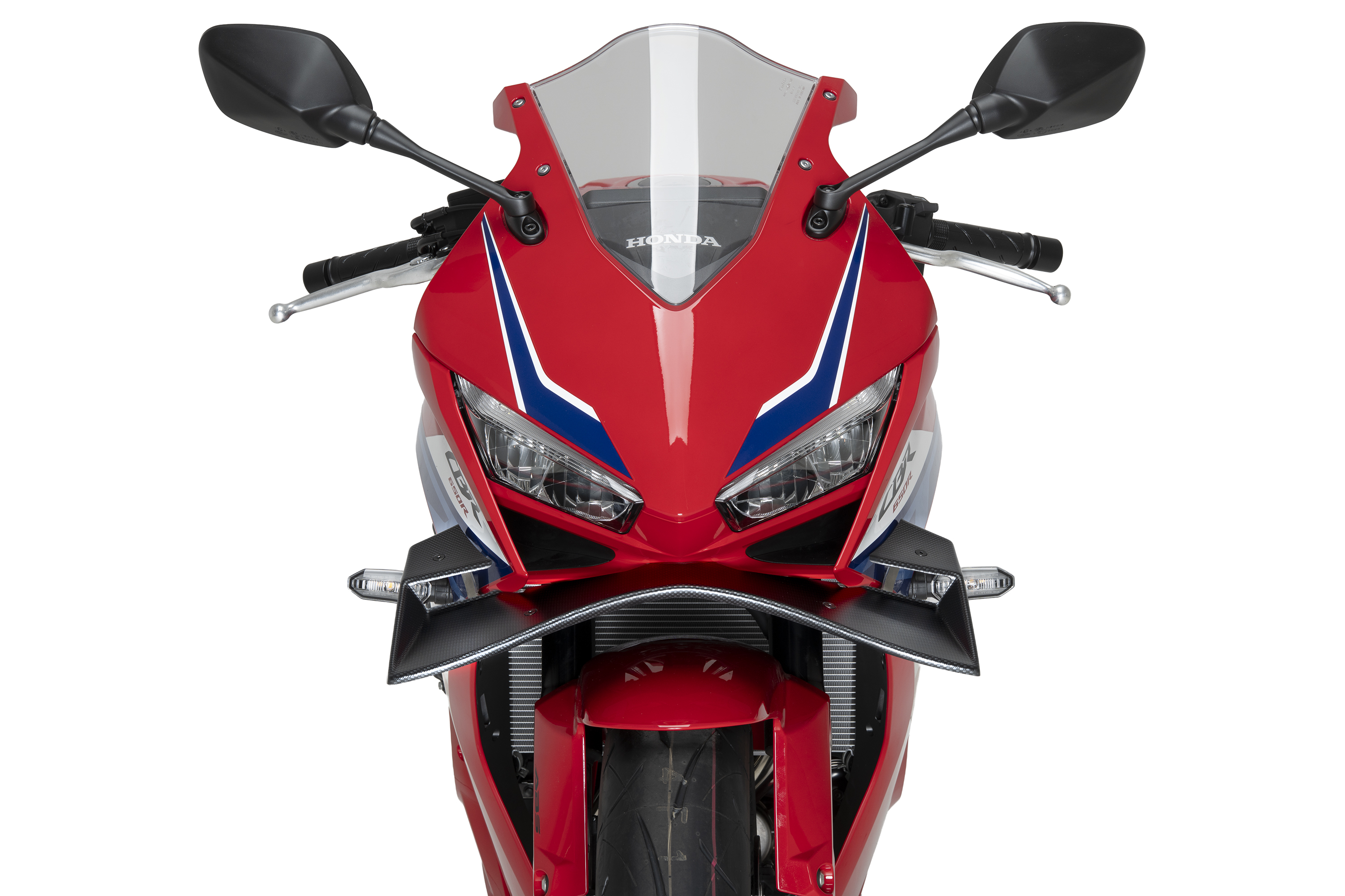 Refuerza la estética Racing y mejora la aerodinámica de tu moto con el nuevo alerón frontal GP de Puig.