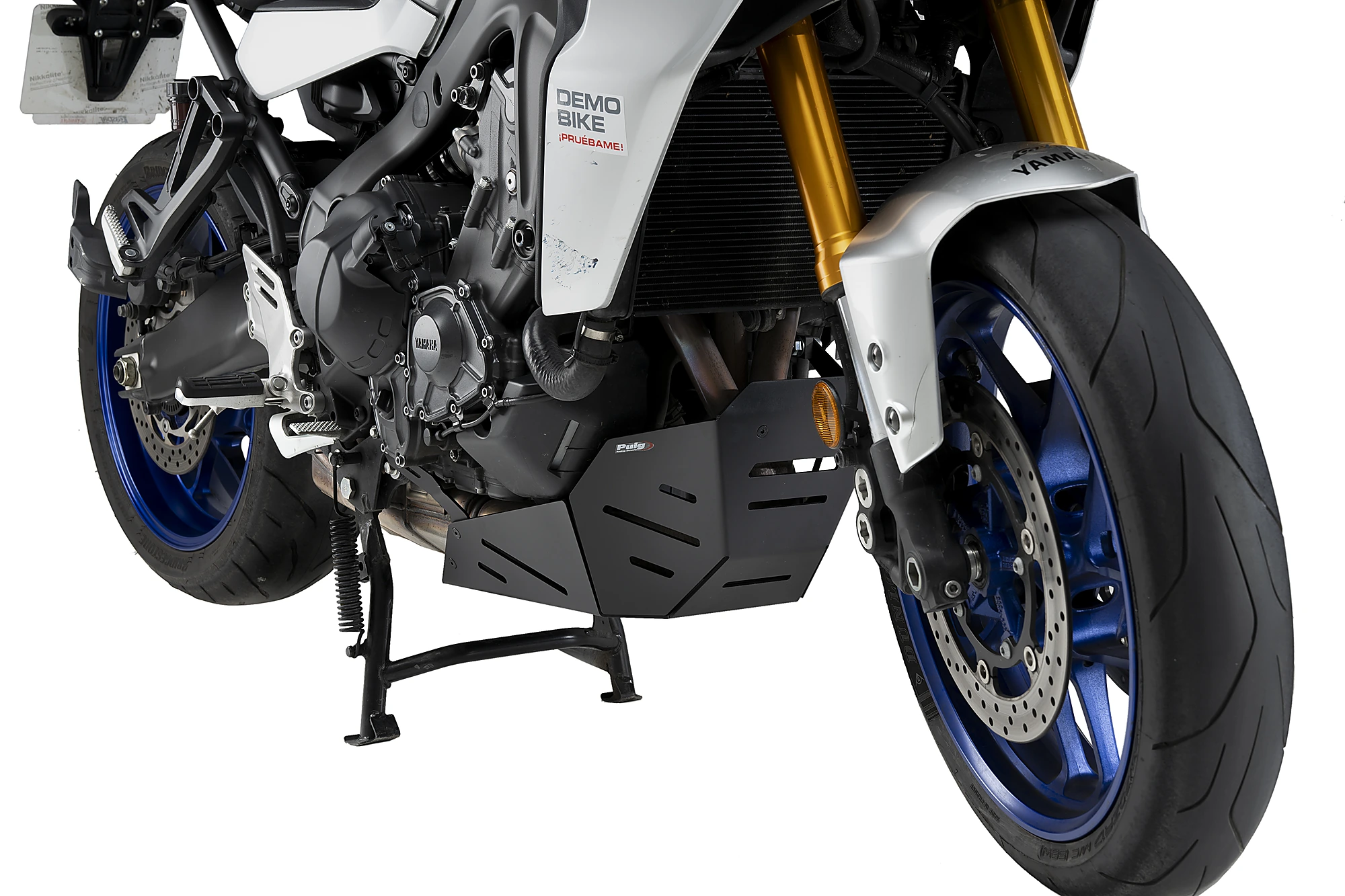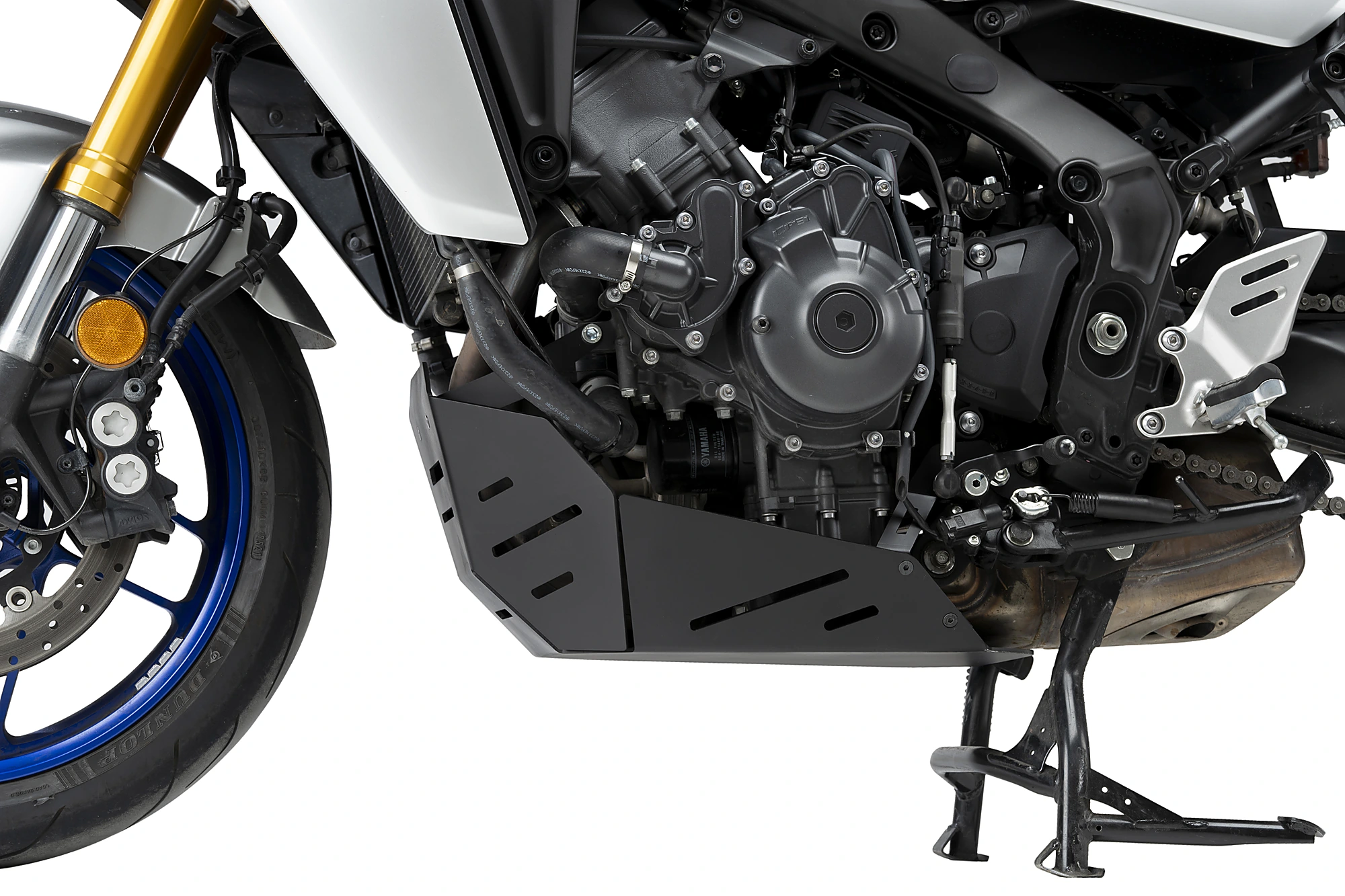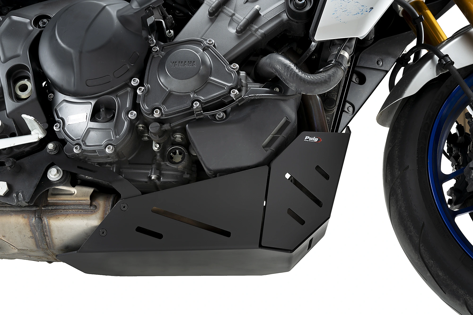 El protector de cárter de Puig para la Yamaha Tracer 9 GT+ consiste en una placa protectora ligera con un diseño que combina simplicidad y agresividad. Su función principal es aumentar la protección del tubo de escape y del cárter frente a posibles impactos de barro o piedras, especialmente en zonas que quedan muy expuestas al realizar conducción off-road.