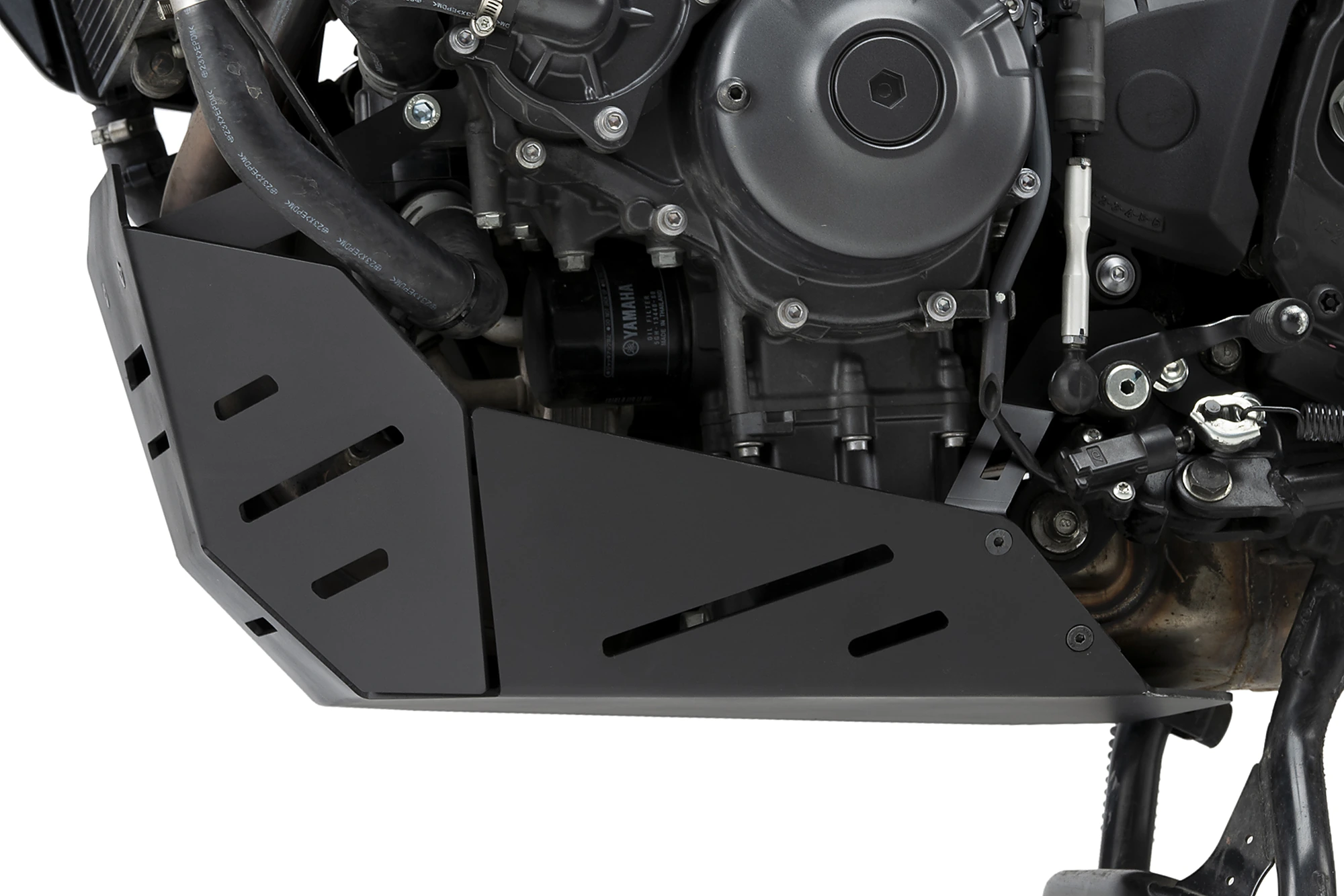 La parte inferior del protector es totalmente plana, lo que facilita levantar la moto en el taller mecanico desde la parte inferior si es necesario, y dispone de agujeros para garantizar una buena refrigeración y evacuar el agua, barro, o pequeñas piedras acumuladas. Además de facilitar  la operación del cambio de aceite evitando quitar el protector.