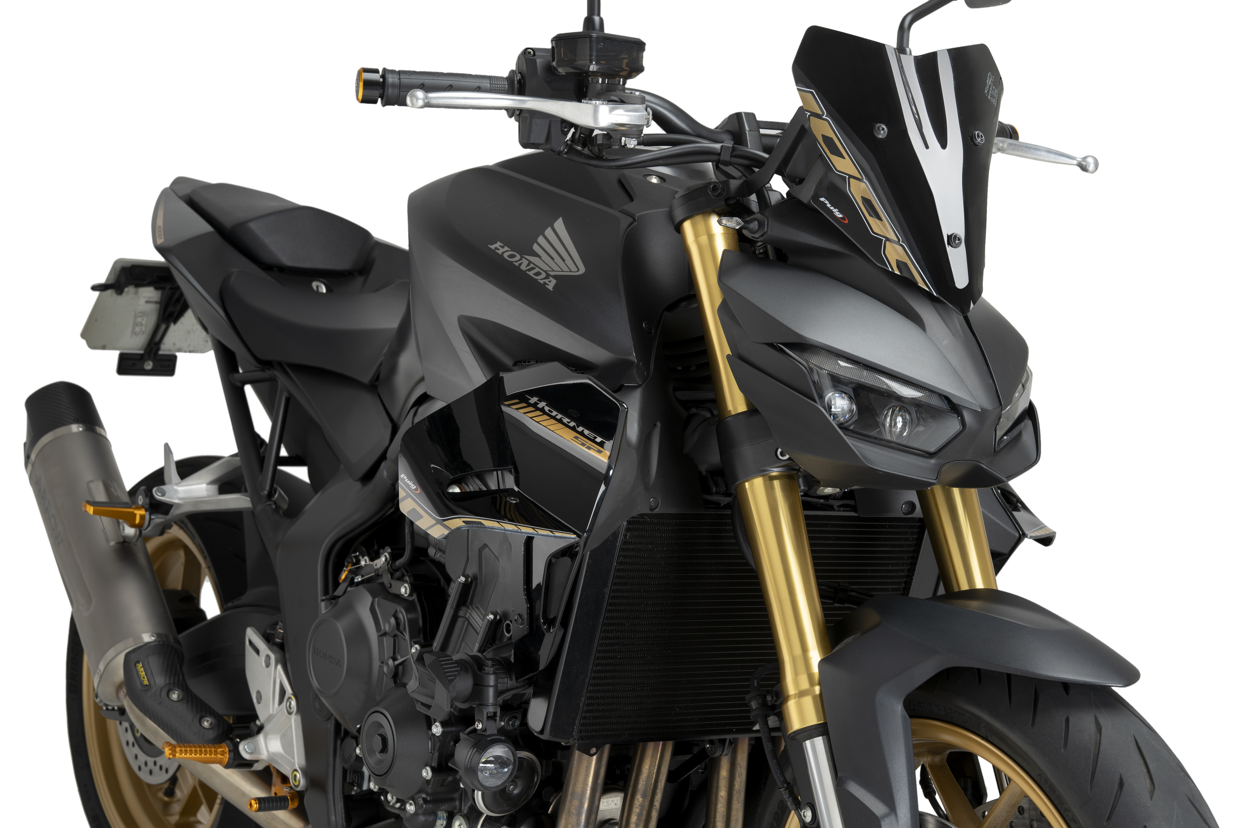 Livré avec des supports en aluminium de 3 mm avec finition noire brillante, identique aux caches latéraux originaux de la Honda CB1000 Hornet.