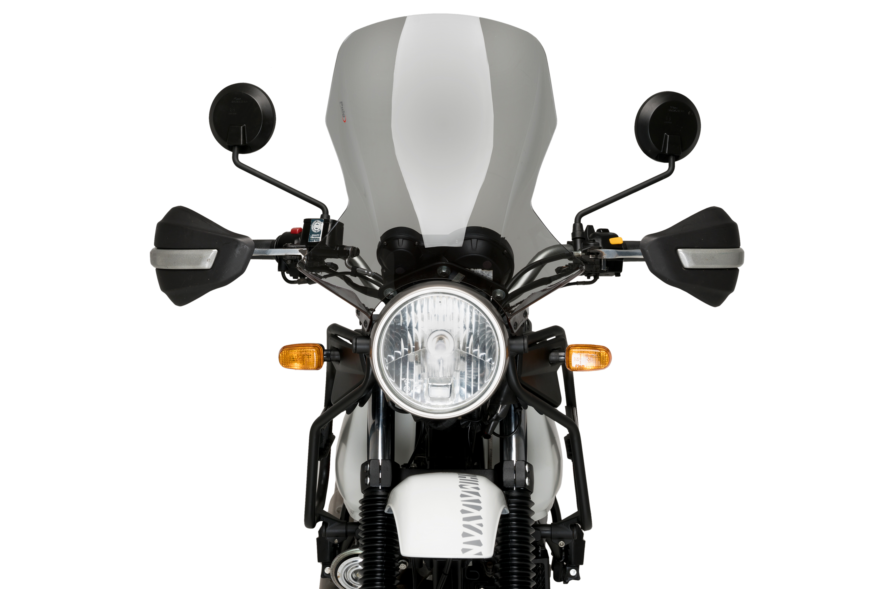 Avec des mesures globales de 405 mm de large sur 450 mm de haut, la bulle Puig Touring est 90 mm plus haut que le pare-brise Royal Enfield Himalayan d'origine. Elle est compatible avec les protège-mains d'origine.