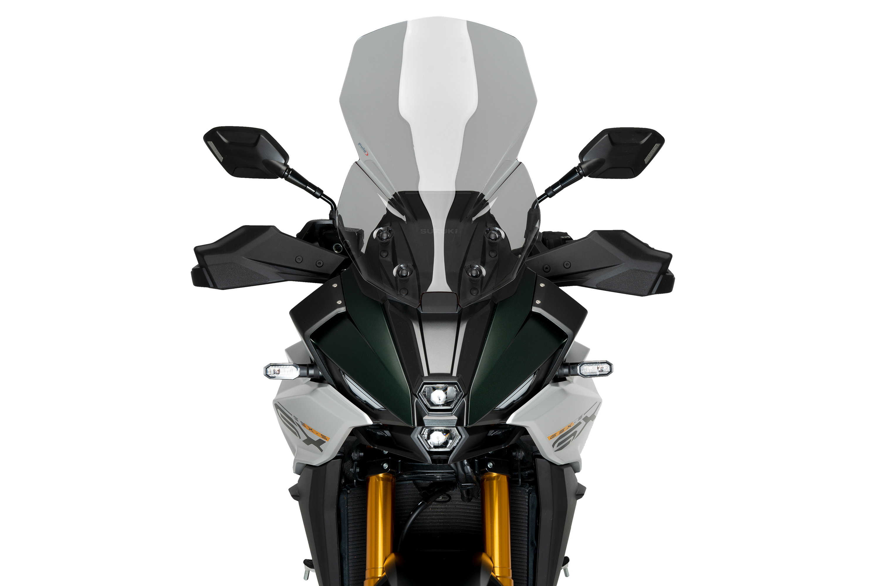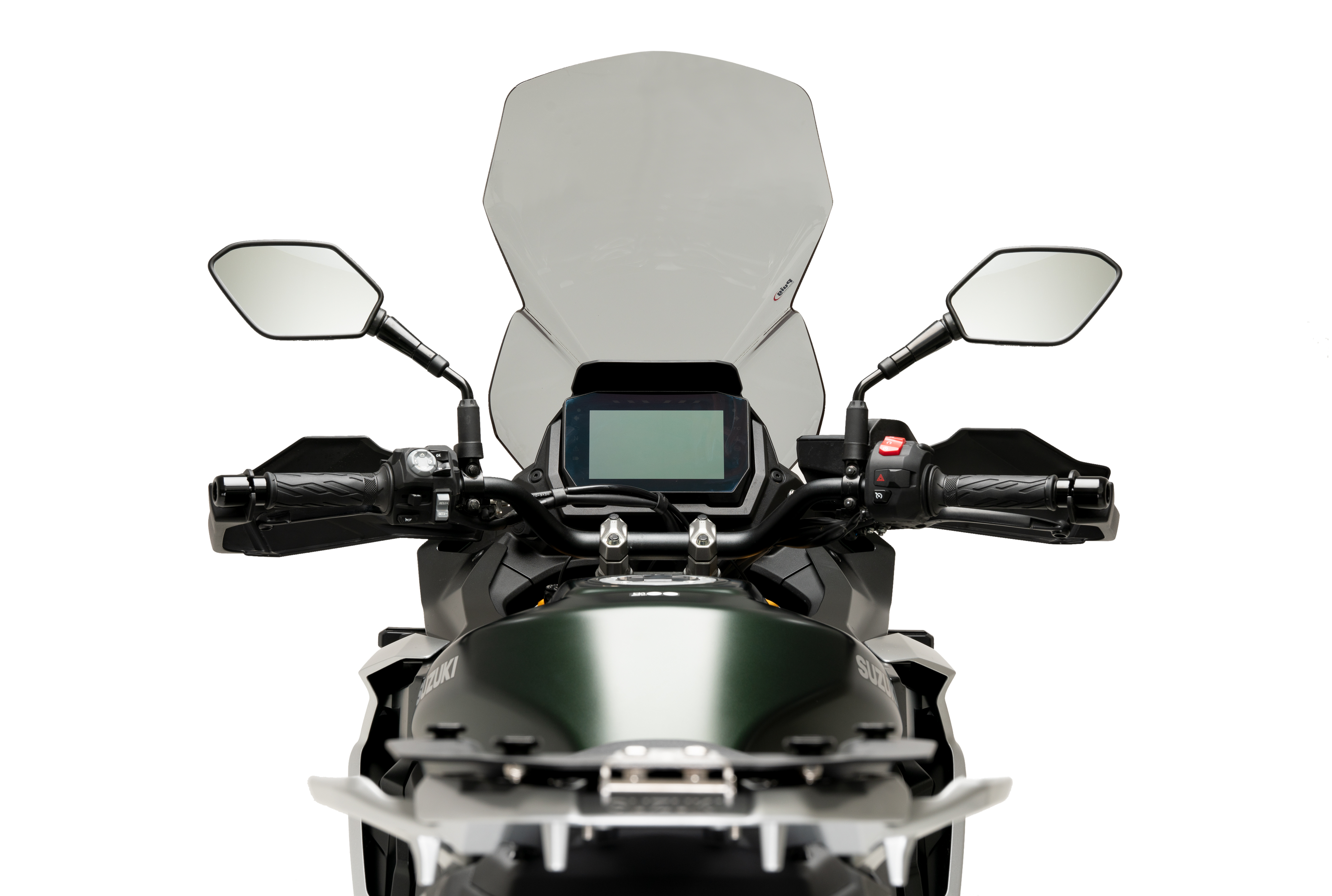Conçu et fabriqué par Puig à Barcelone, il est fabriqué en matériau acrylique CN de haute qualité de 4 mm d'épaisseur, offrant une grande résistance, légèreté et une visibilité claire à travers celui-ci. Avec des dimensions totales de 600 mm de haut sur 370 mm de large, le pare-brise Touring de Puig est 200 mm plus haut que l'écran d'origine de Suzuki.