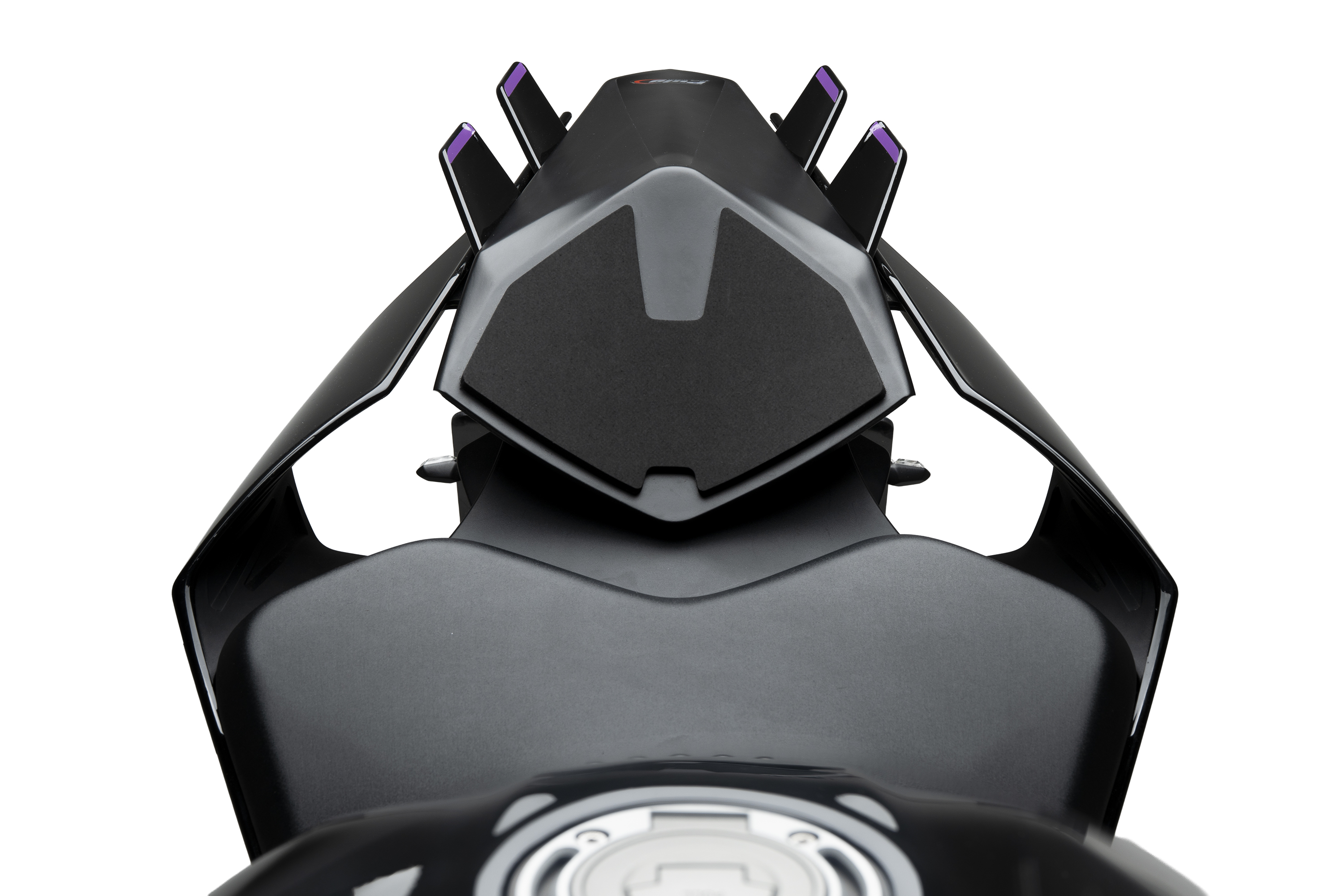 De plus, la selle est conçue avec des canalisations internes qui la rendent légère et aident à réduire les turbulences générées par l'air lorsqu'il entre en contact avec le pilote et le volume de la moto. Elle intègre également une mousse noire à l’avant, semblable à celle utilisée par les pilotes de compétition, offrant plus de confort et de soutien au pilote lorsqu'il s’adapte à haute vitesse.