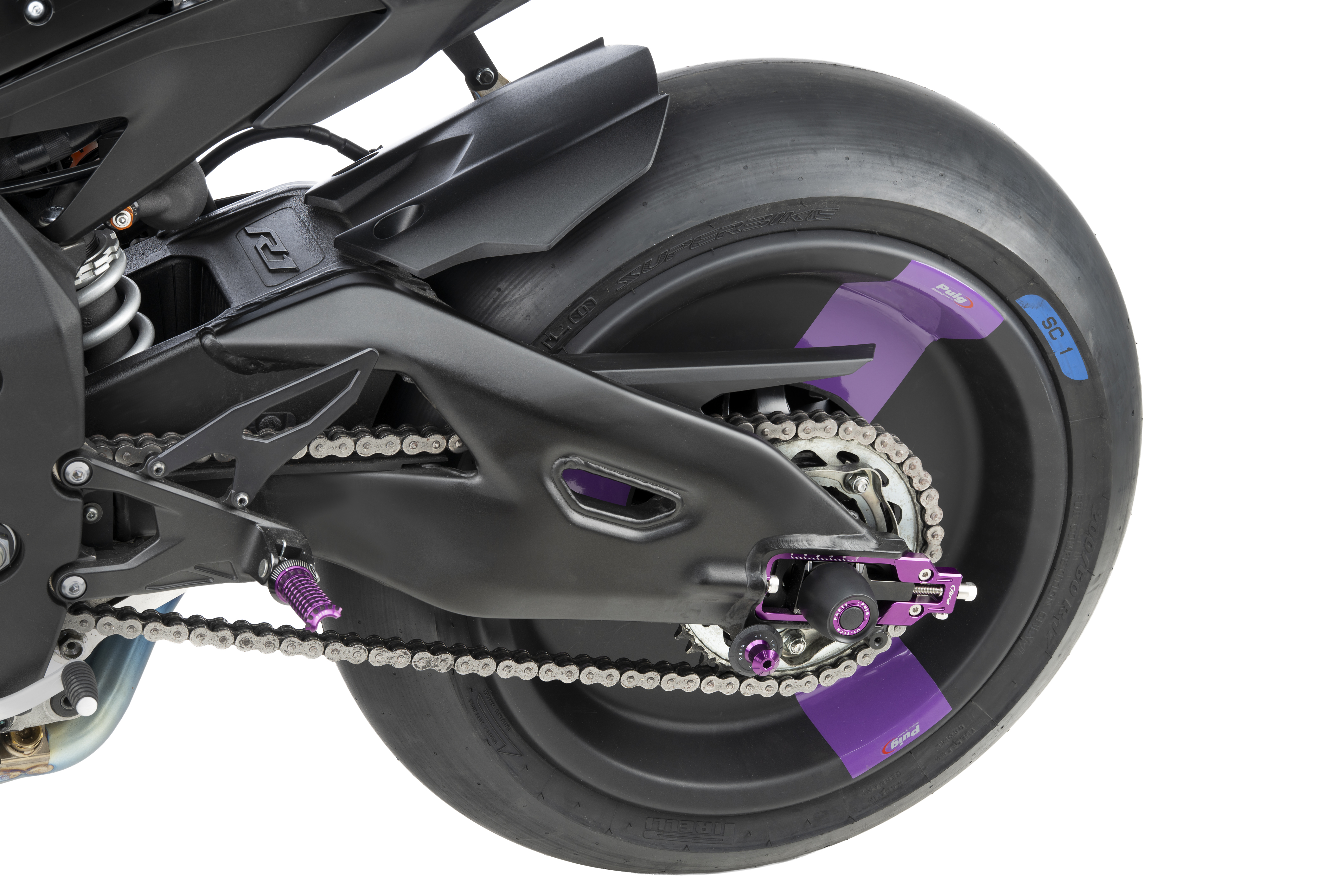 Les diabolos servent de guide à la béquille  pour pouvoir soulever votre moto facilement, rapidement et en toute sécurité. Dans ce cas, nous vous présentons le Diábolo Pro Puig. Fabriqué à partir d’une masse d’aluminium fresée et anodisée (poids réduit à 32 gr), il garantira la protection du bras oscillant contre les éraflures éventuelles car il est accompagné d’une rondelle en nylon noir avec la sérigraphie Puig Hi-Tech Parts.