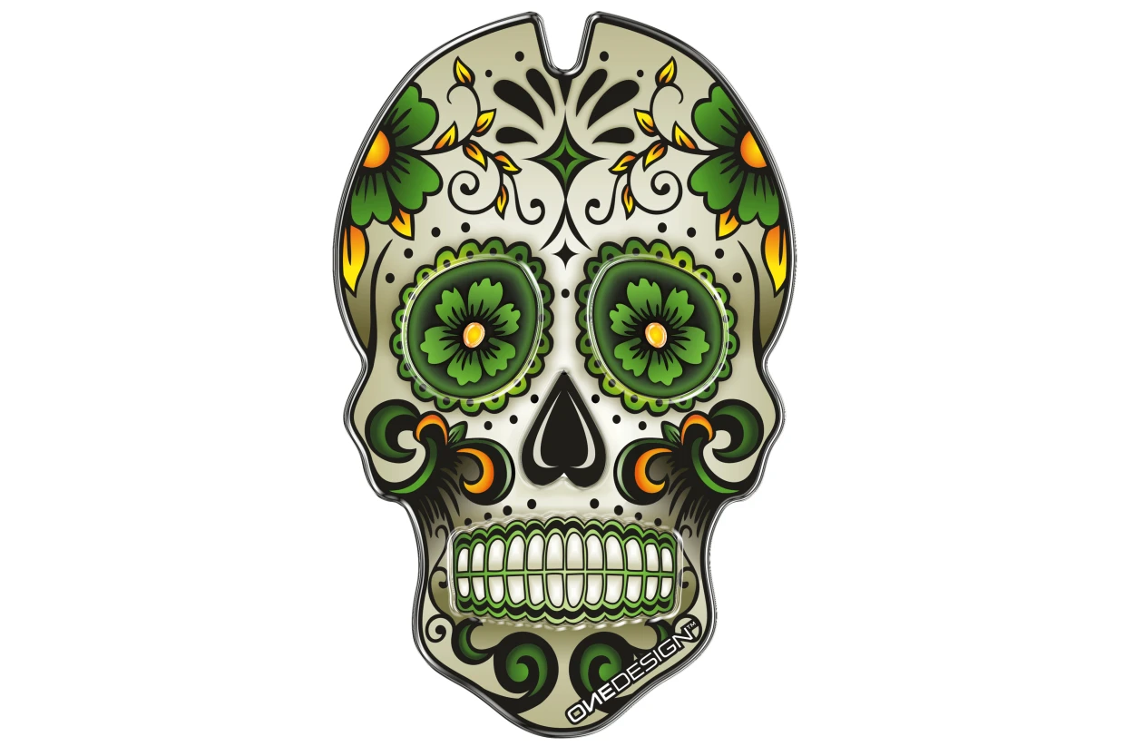 Questo teschio bianco dai toni rossastri e arancioni darà un tocco moderno e giovanile al vostro deposito, ma lo manterrà anche come il primo giorno. Grazie alla sua produzione in plastica flessibile di alta qualità è possibile adattarlo alla vostra moto, qualsiasi sia. Il materiale proteggerà il deposito da eventuali graffi della giacca e la sua durata è assicurata, anche se si parcheggia sulla strada.