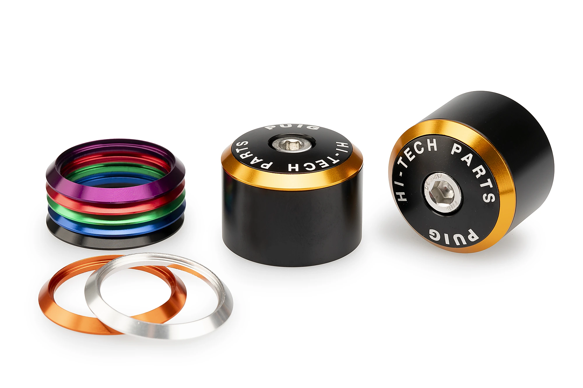 Prodotto da un blocco di alluminio di alta qualità per ottenere un pezzo leggero e resistente. Sono composte da tre parti, un corpo centrale, un anello disponibile in vari colori per ottenere il miglior abbinamento con la moto, e un fondello con la scritta Puig Hi-Tech Parts.