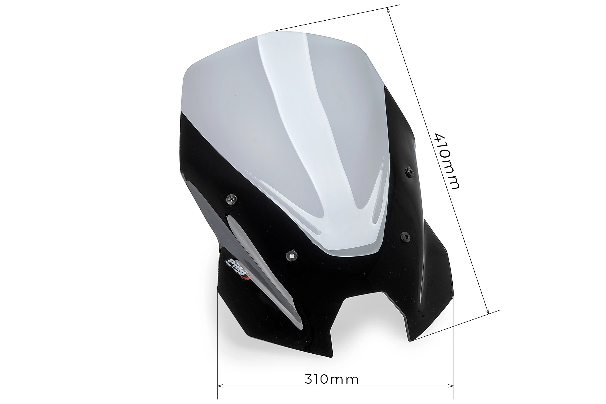Le dimensioni totali del parabrezza sono 310 mm di larghezza, 410 mm di altezza e 80 mm di profondità. Una volta installato, il parabrezza sporge di 250 mm sopra il quadro strumenti, offrendo una copertura aerodinamica superiore.