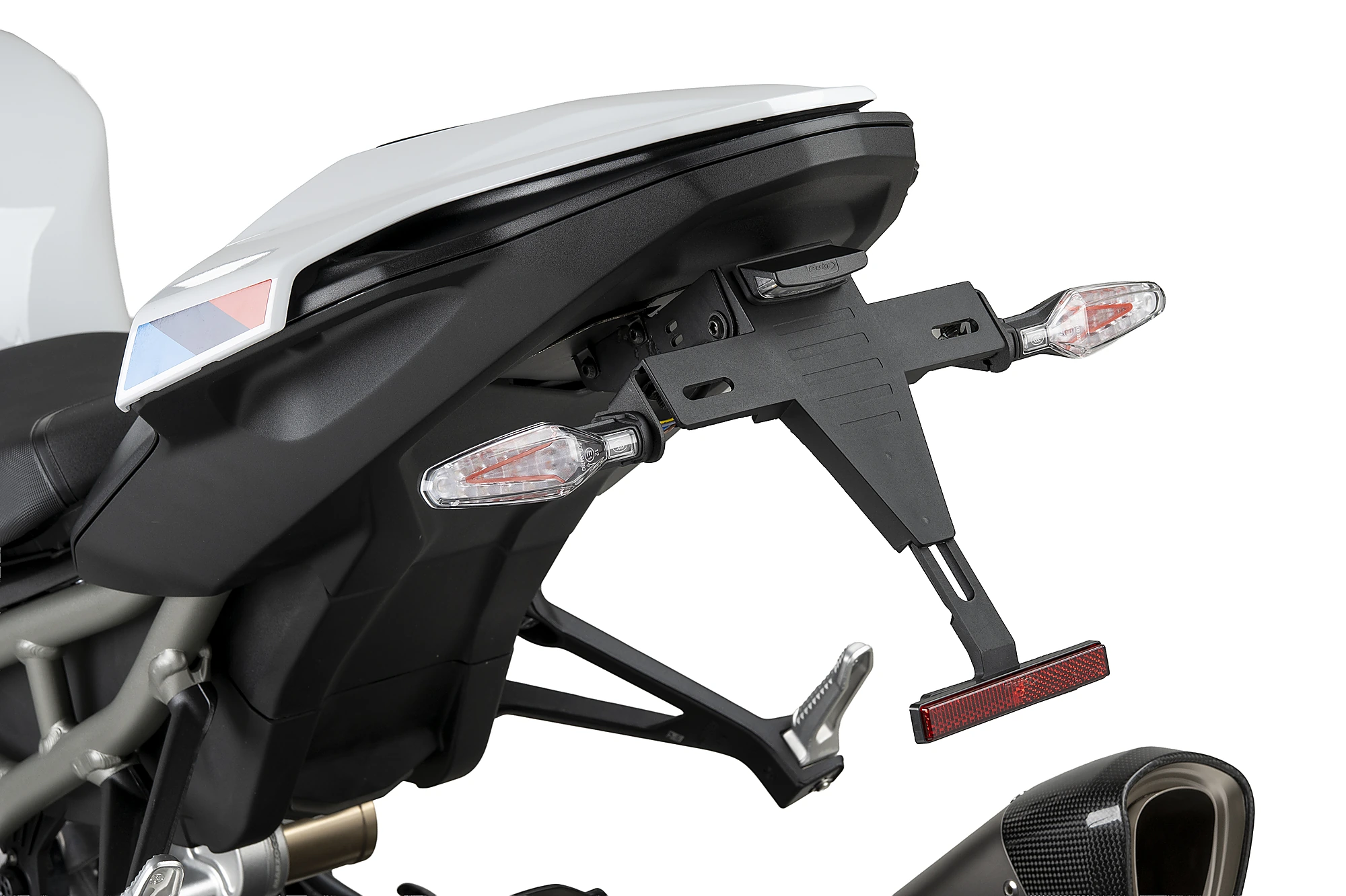 Sostituisci il portatarga originale della tua moto con il supporto portatarga Puig, che, grazie alla sua posizione elevata, dona un aspetto sportivo alla tua motocicletta. Il kit combina parti in acciaio con finitura verniciata in epossidica ed elementi in poliammide, garantendo una significativa riduzione di peso rispetto al supporto originale.